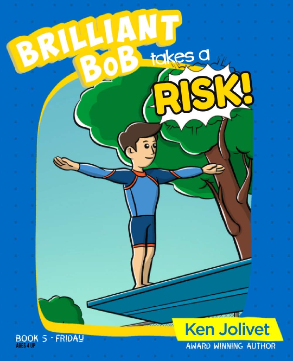 Brilliant Bob has to face his fear of springboard diving if he wants to make his school’s team. Join Brilliant Bob as he learns through training and practice that life is full of risks—but they aren't always as scary as they seem. Bob learns that taking and managing risks can bring excitement, confidence, and success. The Brilliant Bob series contains seven beautifully written and illustrated children’s books that were created specifically to support and encourage young boys. These fun books use the adventures of Brilliant Bob and his three best friends—Dazzling Dave, Genuine George, and Superboy Sam—to teach young boys about crucial aspects of masculinity. The Brilliant Bob books explore and celebrate the benefits of young boys learning to be: Brave - Competitive - Strong - Curious - Sensible Risk-takers - Stoic - Persistent Highlighting, teaching, and promoting positive and healthy masculinity in boys can improve their mental health, self-esteem, and sense of identity. These exciting and relevant books are a great way to strengthen the bond between young boys and their fathers (or other significant male role models). Using these books as bedtime stories is a great way to fill the well documented crucial void of positive masculinity in so many young boys’ lives. The stories, adventures, struggles, and triumphs of Brilliant Bob will help boys as they discover their identity as males and help them take pride in themselves. Boys will love the fun illustrations, and the stories that have been written just for them. And dads and parents will love how these books spark meaningful conversations with their sons about how their masculinity makes them special. Just like Brilliant Bob!