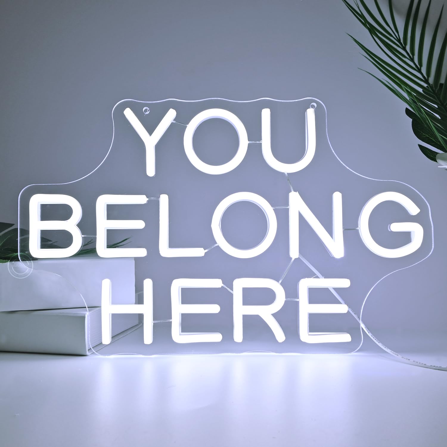 Adjustable Brightness: YOU BELONG HERE led light sign measures 15.86" L x 9.84" H and comes with 6.6ft USB cord wire. You can adjust the brightness with dimmer switch. Easy to Use: The neon sign light with pre-drilled holes for easy hanging. You can hang it on the wall, window or place it on the table, shelf, nightstand. The sign is powered by USB, you can plug it into power bank, phone chargers or computer.(NOTE: Does NOT include a power adapter, INDOOR USE ONLY). Light Up Your Space: You belong here neon sign light is good decoration in your bedroom, living room, bathroom, kitchen, kid’s room, man cave, game room, office, cafe, restaurant, SPA beauty nails hair eyelash salon store, dorm, porch, lobby, dressing room, garage, bar, pub club, music studio, barber shop, tattoo studio. Classroom Wall Decor Sign: Easy to attract the attention of your students and liven up the class atmosphere. A great addition to welcome party, back to school party, school daily activity decorations, adding positive encouragement to the learning space. Great Gift Choice: Have no idea about what to give as a gift? LED neon lights must be the amazing present for teachers,girlfriend, friends, husband, wife, mom, dad, daughter, girls, family, kids, colleague, roommate on birthday Christmas Thanksgiving Day, Valentine's Day, wedding, proposal bridal banquet, dinner parties, graduation, performances. You Belong Here Led neon wall sign home decor wedding backdrop light for Christmas birthday teachers' day gift