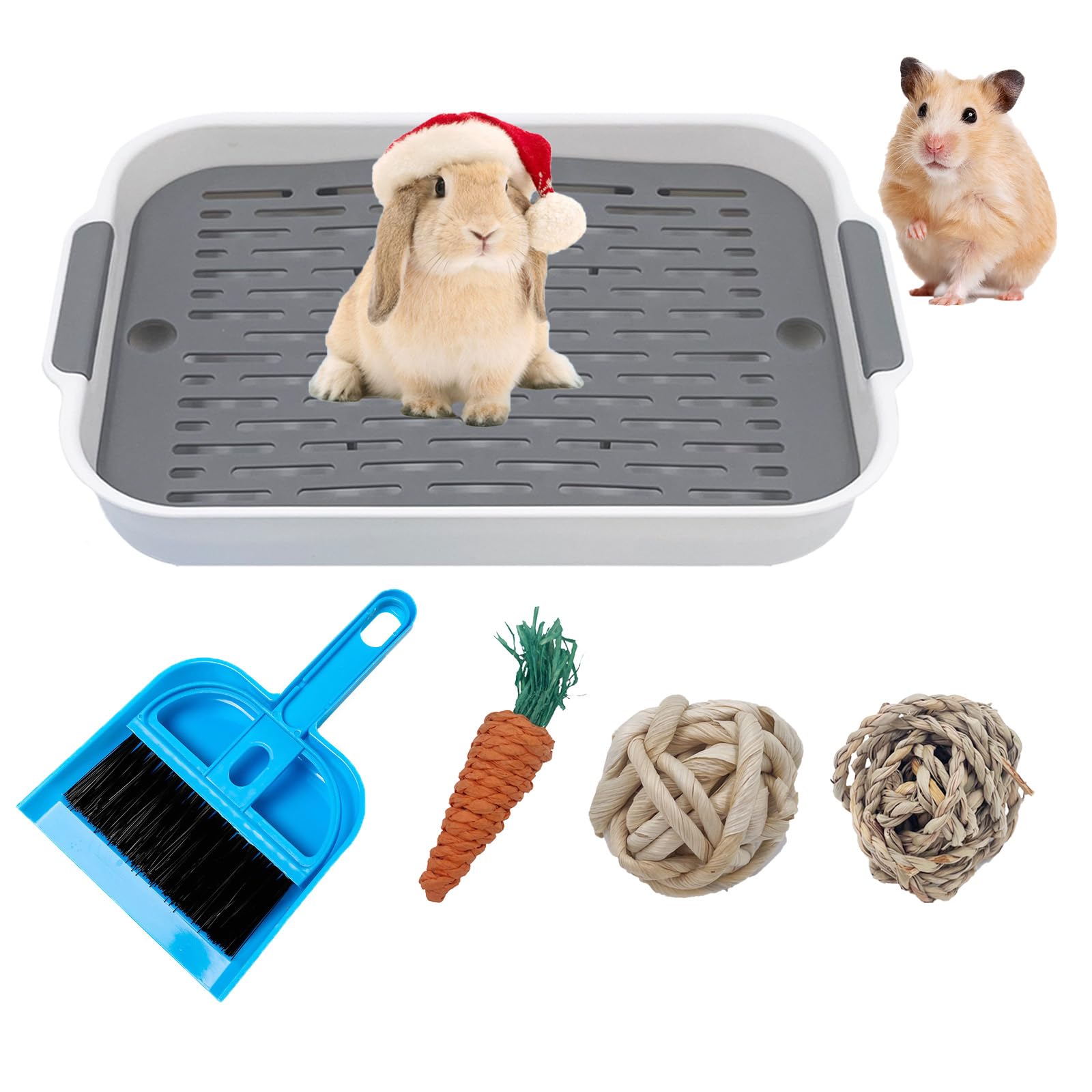 Small Pet Combo Kit Supplies:Our kit includes 1X bunny litter box, 1X cleaning broom, 1X watercress ball, 1X corn rope ball, 1X paper braided carrot toy, you will get a 5-piece kit, which is great for interacting with your small pets, playing with them, and fulfilling their needs to keep their litter box clean! cat litter box small with Double Layer Design:The upper layer of our rabbit litter box is a skeletonized mesh design that easily filters out excess urine, with raised edges to prevent urine spills. The lower layer is convenient for storing pet's feces and urine, pet's food scraps, little pets can play, eat and sleep on it! easy to remove tray:small litter box grid is removable, easy to clean and keep fresh, with clean water can be flushed clean, with clean broom, clean up more convenient and fast, can keep the indoor fresh air, to provide a clean environment for your beloved pets, is conducive to the growth of the pet Toilet with rounded corners design:All four corners of the guinea pig litter box are designed with rounded corners, the surface is smooth and burr-free, comfortable to the touch, placed in a stable position, not easy to knock over, and the draining holes are rounded and smooth long strips, which won't get stuck on the main pet's feet, preventing injuries to small pets. Applicable Small Pets:Our hedgehog litter box size is L10.6" X W7.3" X H1.26", suitable for small and medium-sized animals such as bunnies, hamsters, chinchillas, hedgehogs, holland pigs, kittens, guinea pigs, etc.; WARM TIPS: this product is not suitable for adult large rabbits, adult cats. Please make sure to check the size before purchase.