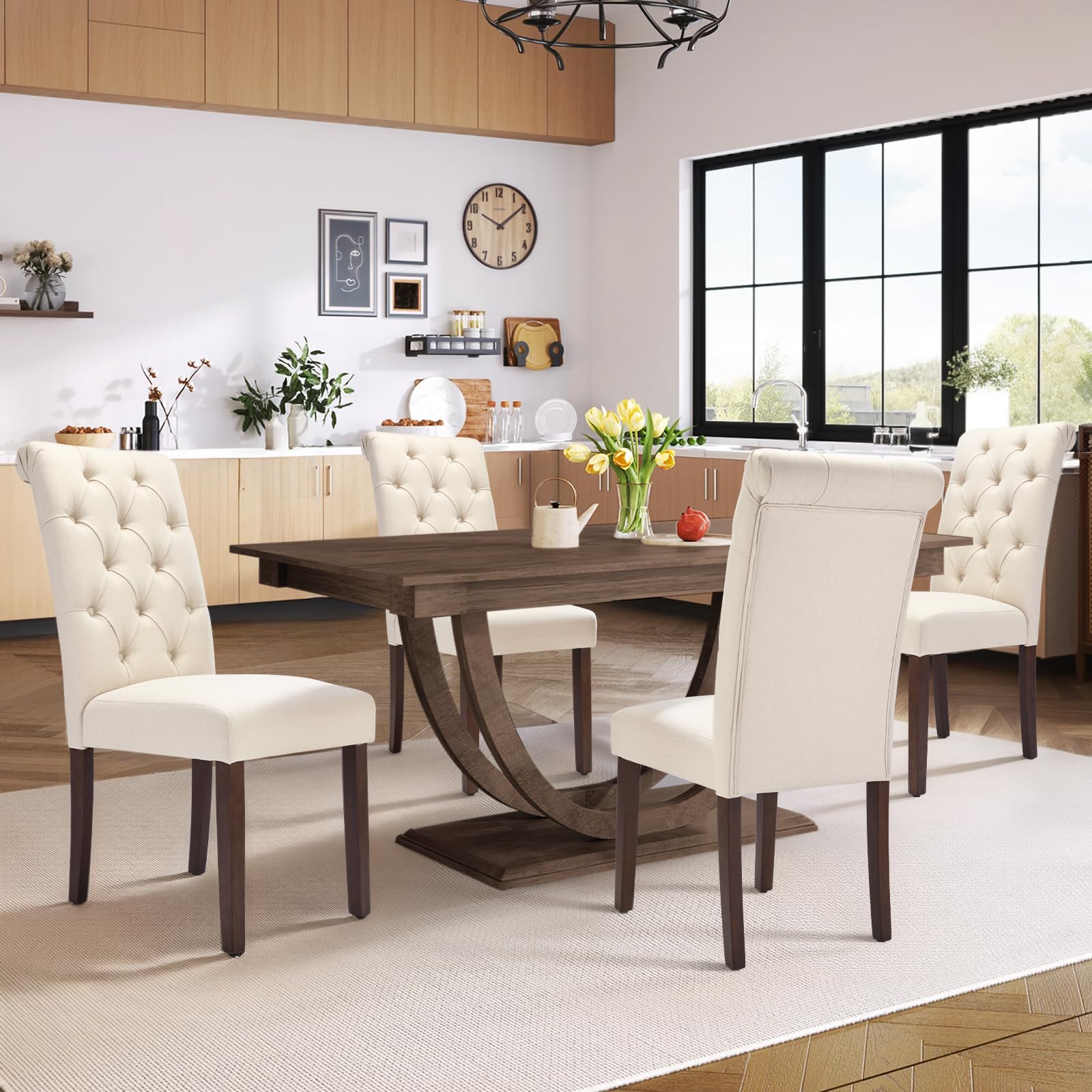 Elegant and Modern Style: This set of stylish dining chairs features diamond tufting detail with deep inset buttons to add a sense of elegance. Sleek and clean lines in modern style make it blend seamlessly with any home decor. These beautifully upholstered parsons chairs create a warm, inviting atmosphere for the dining room Beautiful and Comfortable Fabric: Our parsons dining chairs have soft padded cushion seats covered in linen fabric which is breathable and comfortable, and also easy to clean. You'll feel comfy and supportive sitting and relaxing in these kitchen room chairs with cushioned seats and high backs. It's also an absolute good choice for the living room or waiting room seats. Ergonomic and High-Back Tufted Cushion: The slightly curved high backrest with a roll-back top of these parsons chairs is ergonomically designed to fit your body shape, effectively protecting your waists and back and relieving the fatigue of a long time sitting. They will fit perfectly on your dining table. Roubust and Sturdy Kitchen Chairs: The wood kitchen dining chairs are designed with heavy-duty solid rubberwood legs for optimum support to guarantee solidity and durability. The dining chairs are made of a wood frame with rubber legs in wulnut finish that can hold up to 250 lbs. Rubber feet on dining chair legs aim to prevent the floor from scratching. Versatile Usage: Come with two chairs, the set is ideal for family gatherings or dinner parties with friends. It can be widely used for daily dining or special events like meetings, wedding banquets, and celebrations, as a side chair or dining chair in the dining room, living room, meeting room, hotel, restaurants, or any other ceremonial decorations.