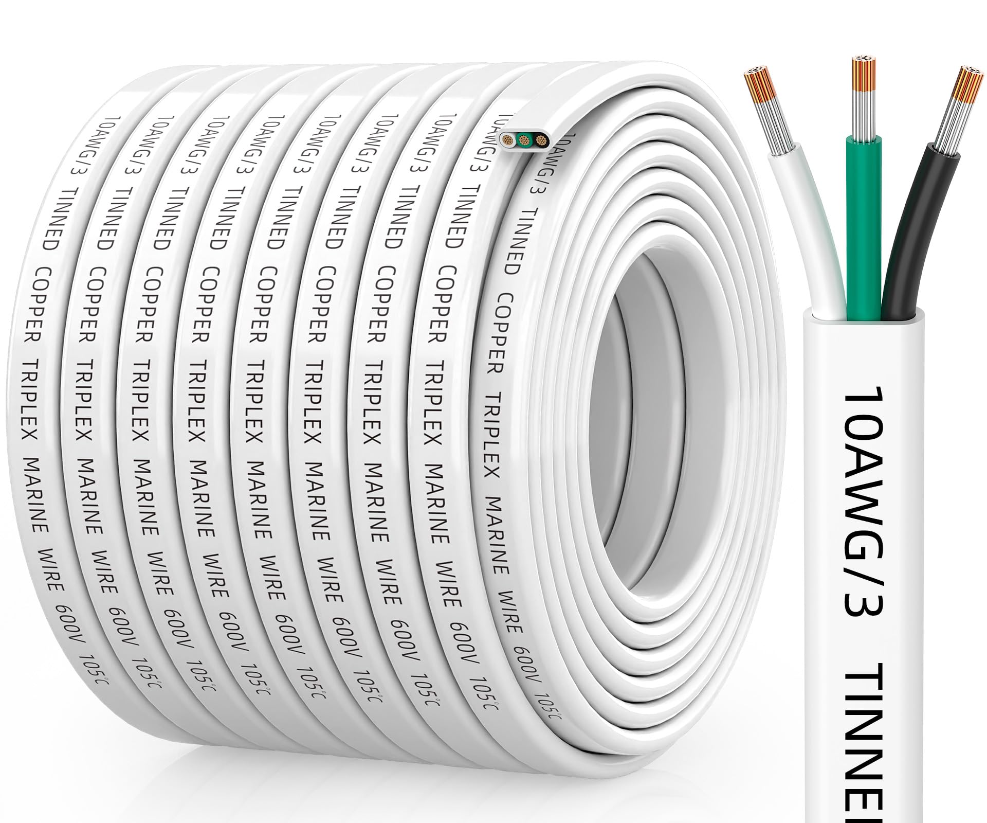 HIGH QUALITY: CONEPY marine wire is crafted from high-precision, oxygen-free tinned copper strands, offering excellent conductivity, stability, and corrosion resistance. Its current-carrying capacity is 2-5% greater than that of aluminum wire, effectively preventing interference and ensuring a long service life SUPERIOR PVC JACKET: The 10/3 gauge marine wire features a high-quality, thick PVC insulation jacket that provides robust protection against wire oxidation, abrasion, saltwater corrosion, UV rays, and high temperatures while maintaining flexibility. It is ideal for ocean use and other demanding environments PRODUCT SPECIFICATION: Each conductor of the 10 AWG wire has a cross-sectional area of 5.29 mm² and contains 75 strands of 0.3 mm tinned copper core, meeting the standards for 10 AWG wire to ensure efficient power transmission and safety RELIABLE PERFORMANCE: Our boat wire meets the UL 1426, SAE, and ABYC standards. Waterproof Rating: IP68; Flame Retardant Rating: VW-1; Rated Voltage: 600V, with compatibility for 5V, 12V, and 24V up to 600V applications; Operating Temperature: -40°F to 221°F WIDE APPLICATION: 10 gauge wire is perfect for various electrical system applications, including marine, automotive, lighting, and home circuits. It is suitable for use in pontoon boats, boat trailers, RVs, vans, solar inverters, LED lights, speakers, and more Multi-gauge to choose: 6/8/10/12/14/16/18AWG seven gauge choose a suitable gauge wire according to your demand and appliances.