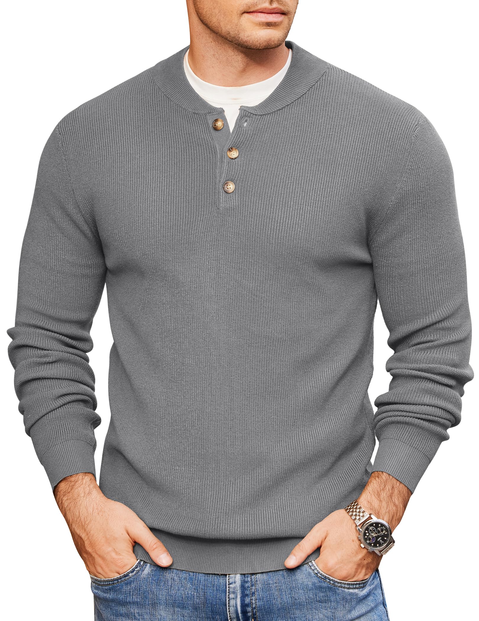 Knitted Fabric --- COOFANDY men henley sweaters is made of good quality fabric, lightweight, stretch, soft and comfortable to wear.The men casual long sleeve sweater will be a great choice for spring, fall and winter Half Henley Collar --- With 3 button front neckline, long sleeve, half collar designed, this men's fall fashion shirts will add a touch of fashion style to your off-duty or your office looking. COOFANDY men casual lightweight sweaters will keep you warm in winter Clothing Match --- This casual business sweater for men could complete any look with jackets, shirts, demins, jeans, peacoat, chinos, blazers and so on for a daily or stylish look. You can also get a pair of dress shoes with this dress pullover sweater for more of a business look Applicable Occasions --- This men henley shirts is great for spring, fall and winter days. Suitable for daily, business, work, school, church, party, dating, holiday or any other casual occasions. Also the men 3 button pullover is a perfect gift for husband, dad, son, boyfriend and friends Warm Tips --- Note: collars and sizes of this henley shirts have been optimized. Machine wash, normal process. Please check your size with our SIZE CHART before you buy it COOFANDY Men Henley Long Sleeve Sweater Quarter Button Pullover Sweater Dress Knit Sweater