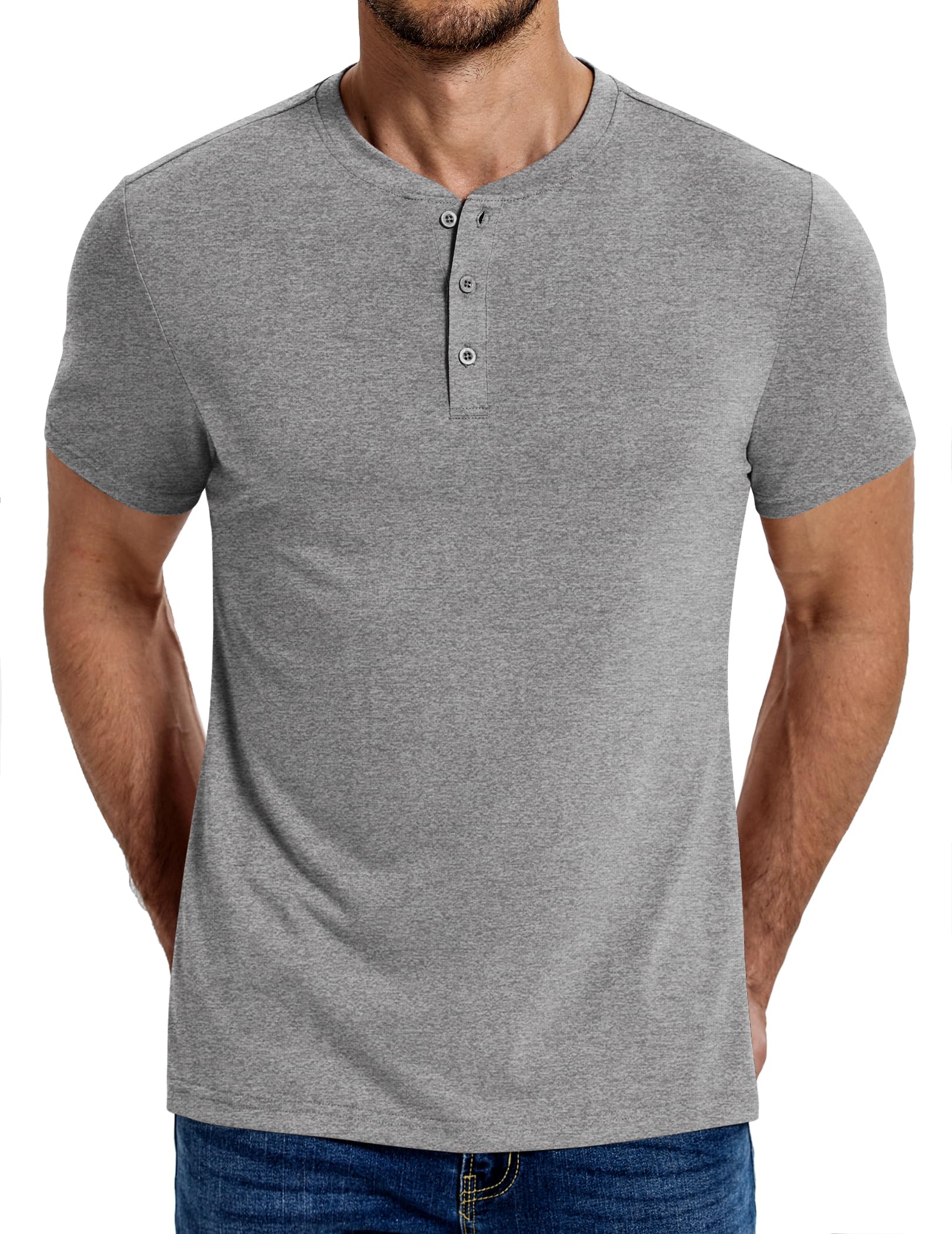 Superior Comfort Fabric:Crafted from premium materials, mens henley shirts short sleeve offer a lightweight and breathable feel, ensuring you stay cool even on the hottest summer days. The soft and comfortable cotton fabric with added stretch caresses your skin, providing all-day comfort for any activity. Stylish Design:Henley shirts for men feature a timeless henley style with a round neck, classic three-button closure, splice cuffs, slim fit and solid color—all crafted with a slim fit that flatters your physique. The well-cut design blends simplicity and sophistication, ensuring a sleek, never-out-of-fashion look for any occasion. Clothing Match:These short sleeve henley shirts for men serve as versatile staples for your wardrobe. Pair them with stylish jeans, tailored chinos, or slim-fit shorts for an effortlessly cool casual daily look. For a laid-back summer vibe, layer with trendy hats and sunglasses to complete the carefree aesthetic. Occasion Versatility:These mens shirts casual stylish shine in various settings. Wear them for spring, fall and summer, casual outings, family gatherings, social events, or dates. They also fit work and business casual environments, adapting effortlessly to your schedule. Men's casual henley shirts is a gift that will satisfy your son, husband, father and friends. Easy Care:These basic henley t-shirts for man prioritize convenience with wear-resistant fabric that withstands daily use and washing, maintaining shape and color. Durable stitching ensures long-lasting performance for all adventures. Simply machine-wash—they retain softness wash after wash, requiring no special care. Enjoy effortless maintenance. Please check size chart before ordering these mens summer tops to ensure accurate fitting. If you want a looser fit style, please take one size up COOFANDY Men's Casual Henley Shirts Classic Button Cotton Short Sleeve T-Shirt Summer Basic Solid Lightweight Tees