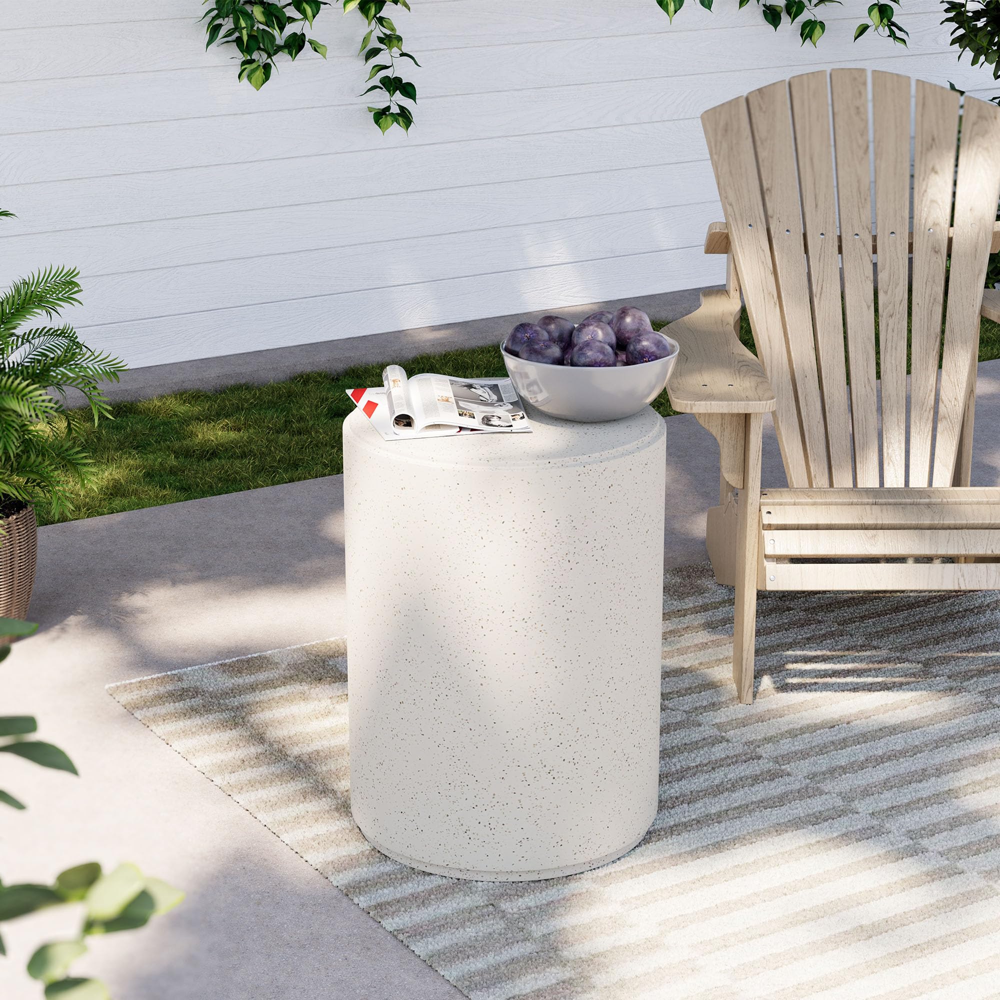 All-Weather Durability:Crafted from premium magnesium oxide , this cement outdoor side table blends exceptional strength with timeless elegance. Its unique speckled white finish naturally conceals everyday wear, while the weather-resistant design withstands harsh sunlight, heavy rain, and fluctuating temperatures. Ideal for transforming your balcony, garden, or poolside, low-maintenance oasis that stands the test of time. Modern & Minimalist Design: The soft speckled white surface creates an airy, beach-inspired vibe that brightens any outdoor space. Smooth cylindrical curves (15" diameter) and a tall columnar base (21" high) deliver contemporary elegance, while the matte texture adds organic warmth to modern patio furniture arrangements. Versatile Multi-Scene Table:as a poolside drink table with a slip-resistant surface, a garden plant stand for succulents, a balcony coffee table at the perfect breakfast height, a patio side table for books by lounge chairs, an end table for keys and décor, and a bedroom table . Its 21" height pairs perfectly with patio loungers, while the 15" surface comfortably holds a tablet and coffee mug. Effortless Low-Maintenance:This outdoor side table is designed for ultimate convenience with minimal upkeep. Its stain-resistant concrete surface makes cleaning a breeze—just wipe away stains in seconds. Unlike wood furniture, there’s no need for seasonal sealing or special treatments. Spend more time enjoying your outdoor space and less time maintaining it. 【COSIEST Quality Service】No muss, no fuss! Use it straight out of the shipping carton. In the unlikely event of damage during shipping, our support staff is standing by to talk you through the return process so you can get a replacement as quickly as possible.