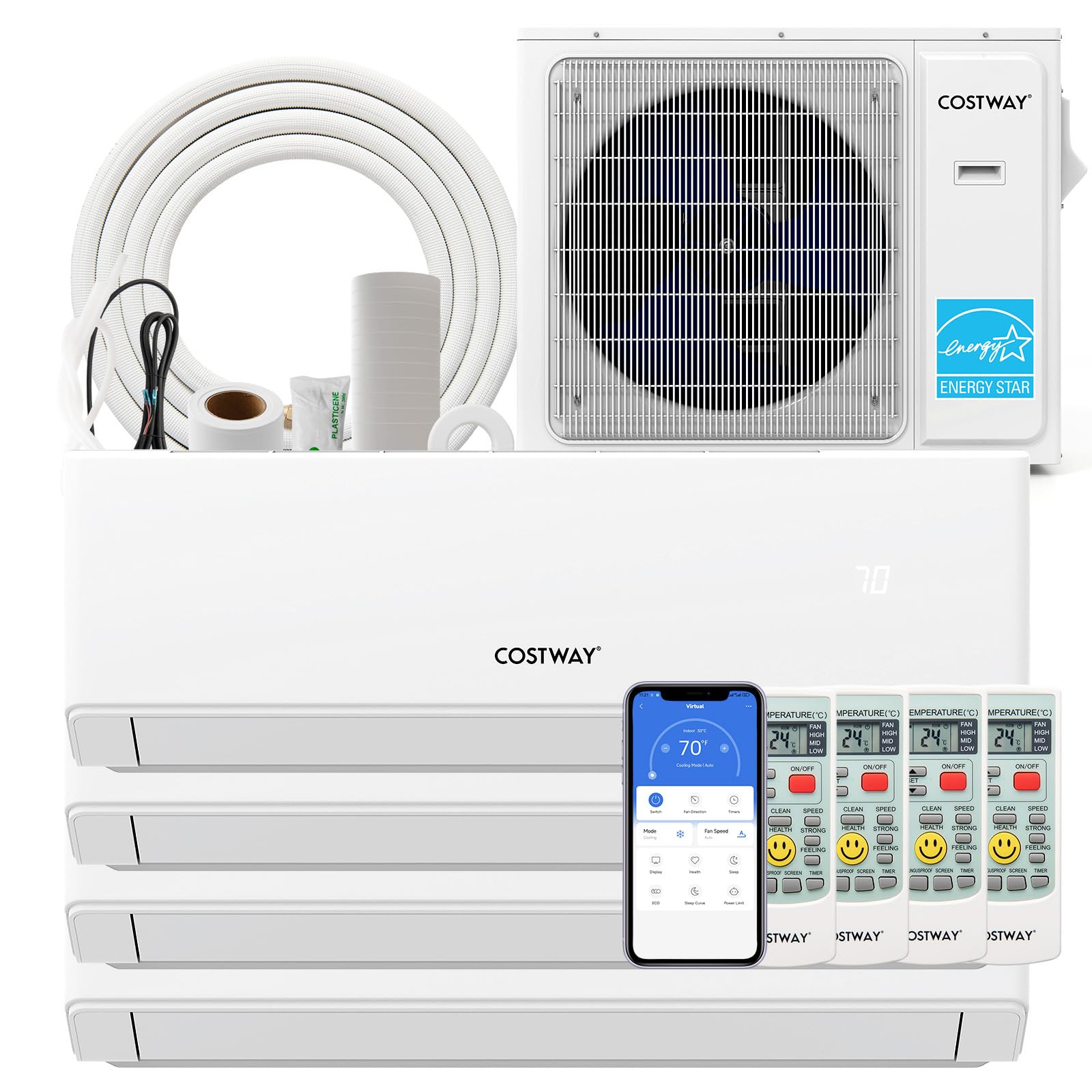 Multi-room Cooling Solution: Designed to cool any corner of your home, this 30000 BTU 4 zone(7000 BTU+9000 BTU+9000 BTU+12000 BTU) mini split air conditioner can dependently adjust the temperature to meet the individual needs of different rooms. The chassis heating function maintains the normal operation of the outdoor unit, enabling it to withstand any climate conditions (-13℉~125℉). Multiple Functions & Modes: This ductless mini split air conditioner offers 6 modes (auto/cool/heat/dry/fan/sleep) and 5 wind speeds (auto/low/mid/high/strong) for you to choose from. Other features such as auto swing, feeling and health extend comfort to daily use. Smart Control, Smart Life: You can easily adjust settings, monitor performance and control your AC from anywhere via your smartphone or the remote control. In addition, the 24-hour timer allows you to plan your climate control around your schedule conveniently. Low Noise & Easy Maintenance: With the quiet sleep mode and screen off function, you can enjoy a restful night. In addition, the filter can be easily removed and cleaned. Please note: A professional HVAC installer is required. Less Energy Consumption, Lower GWP: This energy star certified mini split ac features an innovative inverter technology, operating at a remarkable 23 SEER2 rating and 10 HSPF2 rating. The use of R32 refrigerant brings you a greener lifestyle. Moreover, it is also certified by ETL and AHRI. Description: