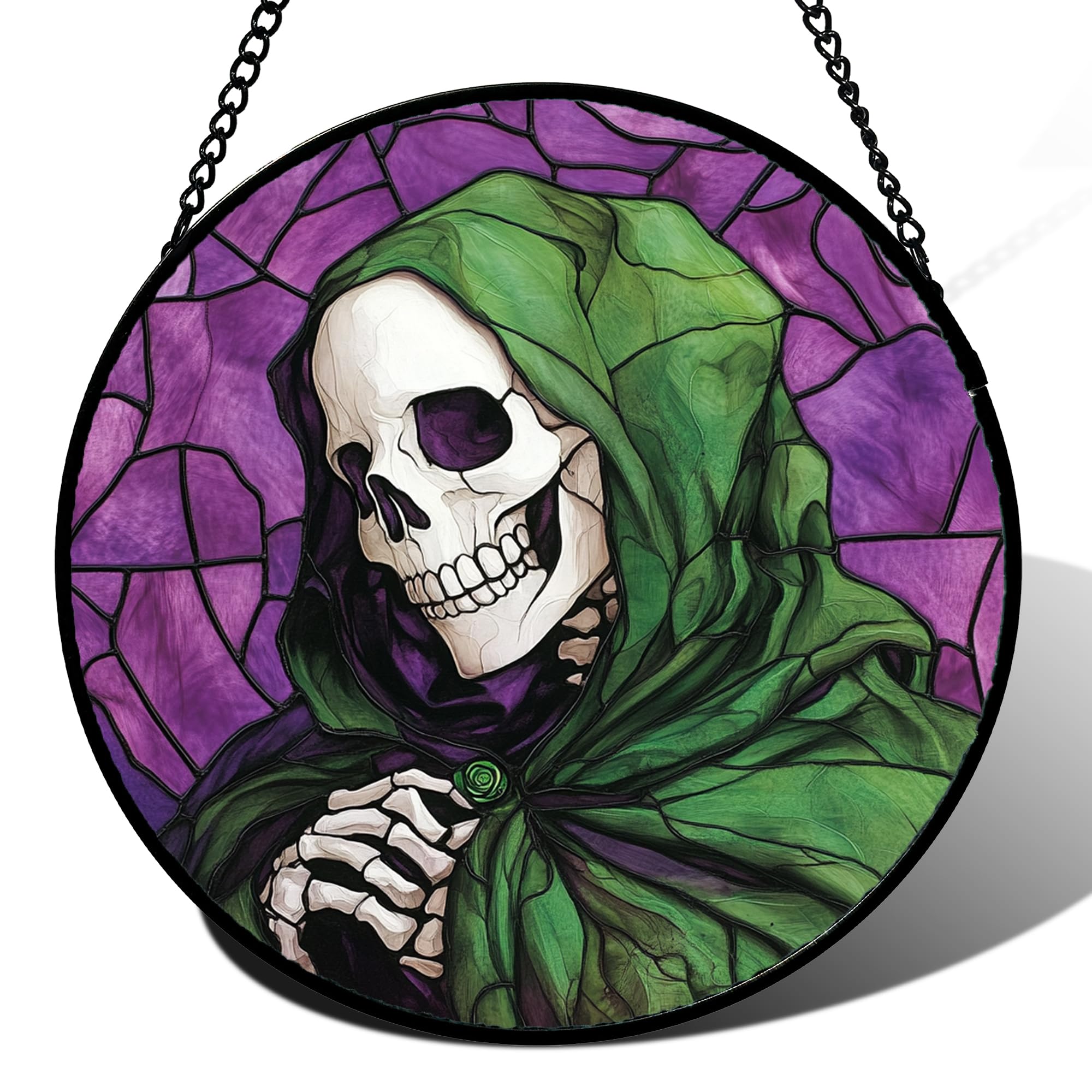 CRISGIF Stained Glass Window Hanging - Halloween Skeleton Grim Reaper Green Cape Suncatcher for Doors Garden Home Spooky Sun Catchers Gothic Decor