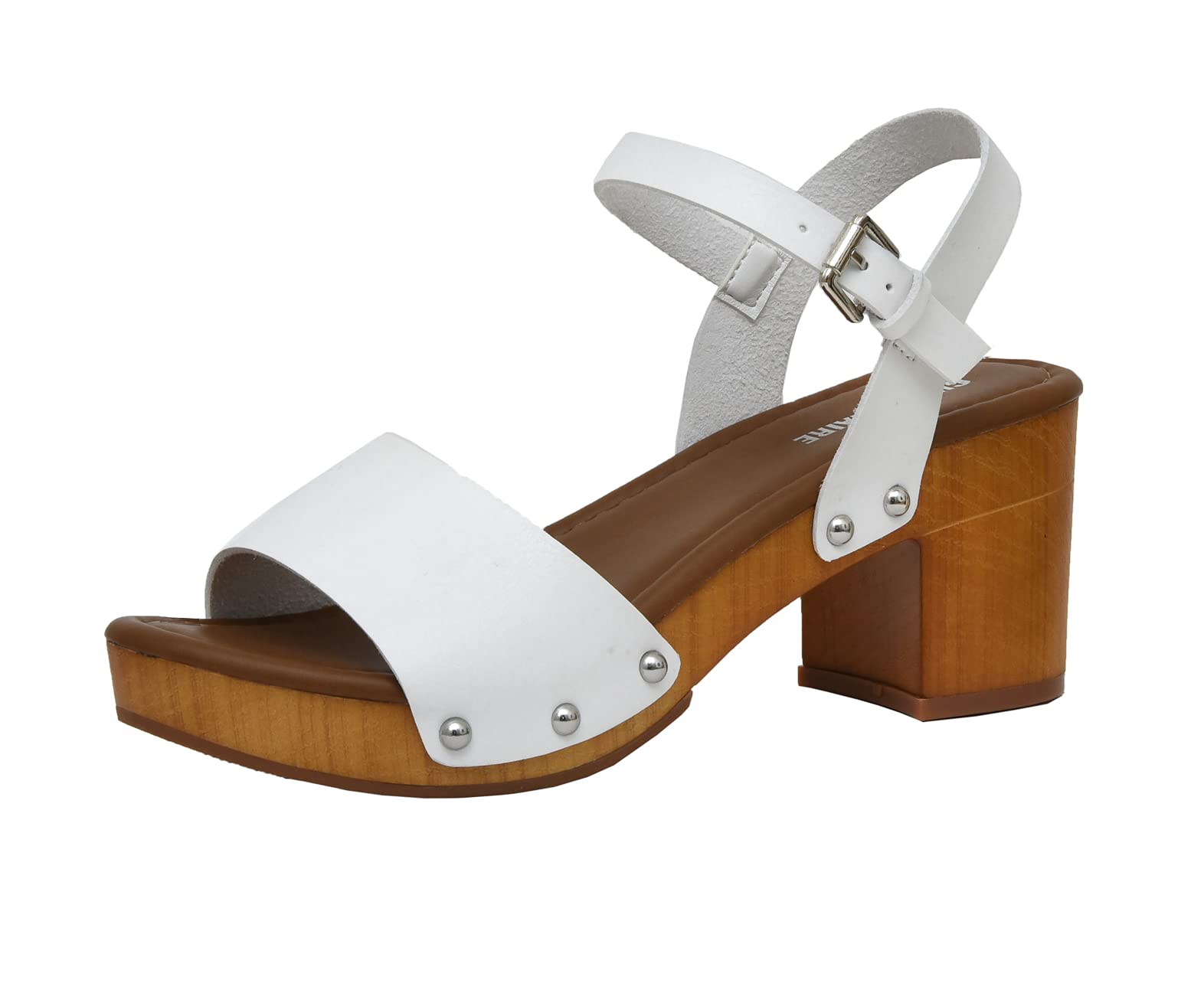 Soft Vegan Leather upper Adjustable ankle strap + a stretch gore for added comfort Comfort foam padded insole LiteSole technology + non slip bottom for ease when walking 2.5 Inch Heel Step into these Faux wooden sandals for the ultimate style and comfort! These sandals feature a soft Vegan Leather upper, Faux Wood outsole with Lightsole Technology and a non skid bottom.