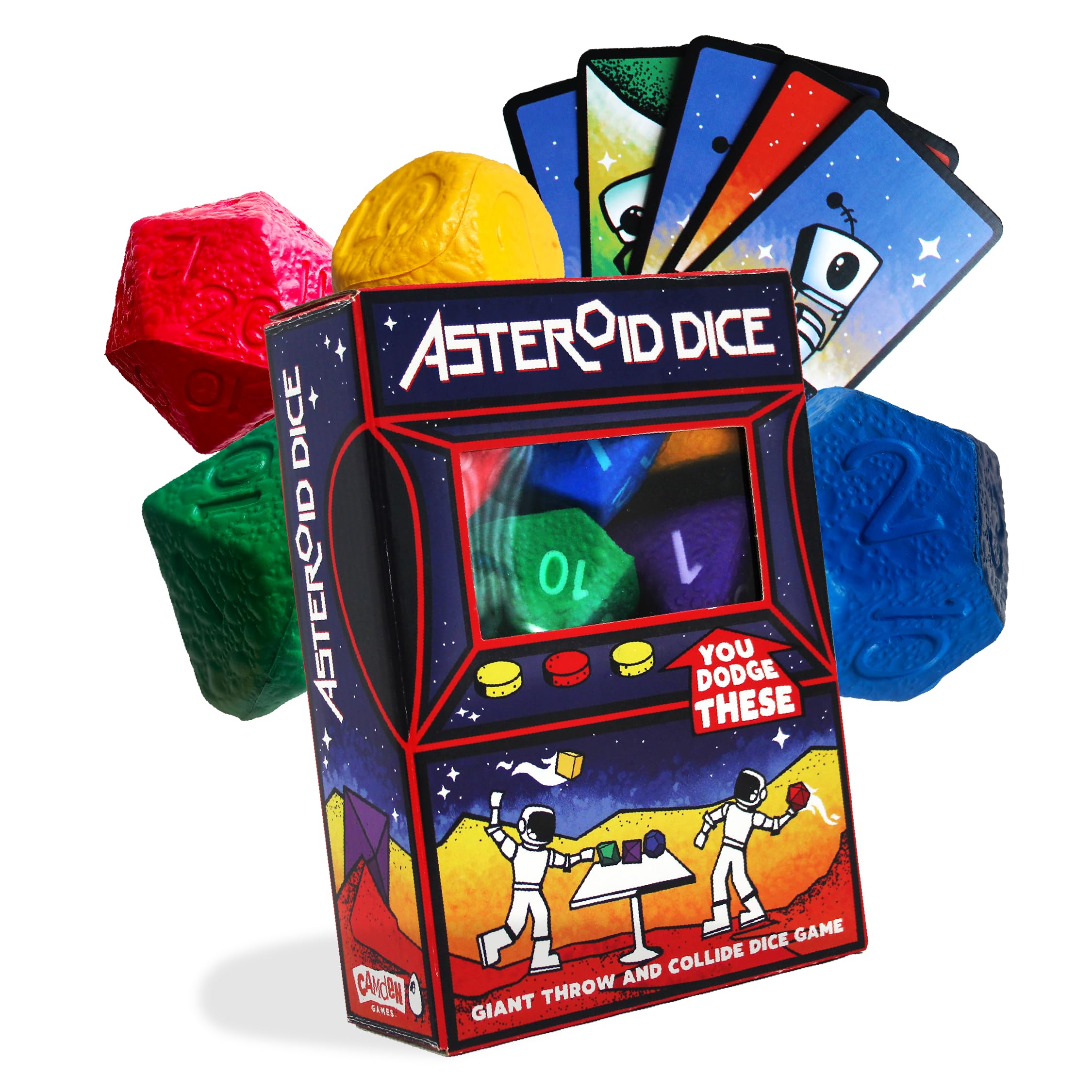 FAST-PACED, ACTION-PACKED FUN – Launch into lively rounds of bouncing, dodging, and dueling with squishy foam dice in this high-energy dexterity game. UNIQUE SQUISHY DICE SHOWDOWNS – Compete to grab and throw dice based on your secret card—if another player picks the same one, it’s game on! STRATEGY MEETS CHAOS – Choose your card and target wisely each round—predict your opponents, outsmart their choices, and aim for a sneaky win! PERFECT FOR PARTIES & FAMILIES– For 2 to 5 players, ages 7 and up. A hilarious game for game nights, kids' birthdays, or casual get-togethers. WHAT'S INCLUDED: 5 x foam Asteroid Dice (6, 8,10, 12 & 20 sided), 35 x Asteroid cards 1 x rules leaflet Asteroid Dice is the exciting, fast-paced dexterity game with giant, squishy dice! Combine strategy, speed, and skill to come out on top. Start by choosing an Asteroid card, then grab your chosen Asteroid Dice. Prepare to face off against your opponent, dodgeball style! Aim, roll, and collide with your opponent’s dice to knock down their scores. The objective is simple: roll the highest numbers in the asteroid field to claim victory points. Use special cards to boost your chances or escape black holes when you’re in a tight spot. Asteroid Dice is the perfect blend of action and strategy—dodge, roll, and aim your way to becoming the ultimate champion!
