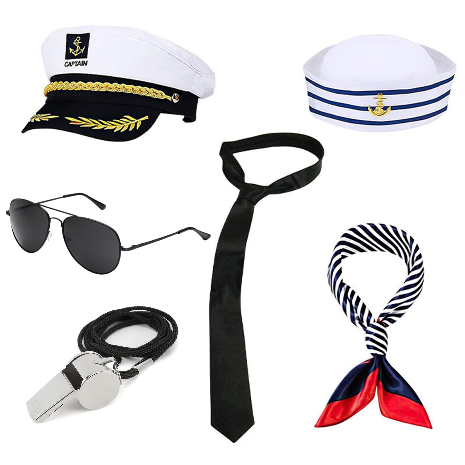 Captain Sailor Costume: You will get a white captain's hat, a navy blue with white sailor hat, a naval style satin scarf, a black tie, a stainless steel whistle, and a pair of sunglasses suitable for daily or party dressing up. Proper Size: Sailor Ship Yacht Boat Captain Hat Navy Cap Hat is a One Size Fits Most Adults. The scarf is 19.6 x 19.6 inches/ 50 x 50 cm, which fit for most adults, and this costume set can give you a nice wearing experience. Reliable and Comfortable: The captain sailor hat and scarf are made of smooth polyester fiber, that is soft and comfortable to touch; The sunglasses feature a durable metal frame and include a stainless steel whistle, designed for enduring durability. Wide Applications: These nautical costume accessories bring entertainment and fun to your party, making them perfect for large occasions. They can also be used as costume props for Halloween, parties, celebrations, family cruises, and more. ATTENTION: It is normal for the appearance to be slightly deformed or bent when you receive the goods due to squeezing during shipping, then please rearrange by hand and it will still maintain a perfect appearance! Backed by our Guarantee, if you're in need costume props, wait no more! Thank you for your understanding! Yacht Captain Costume Set, Sailor Ship Cap Captain Hat Scarf Necktie Whistle and Sunglasses for Men Women Yacht Rock Captains Dressing Up Party