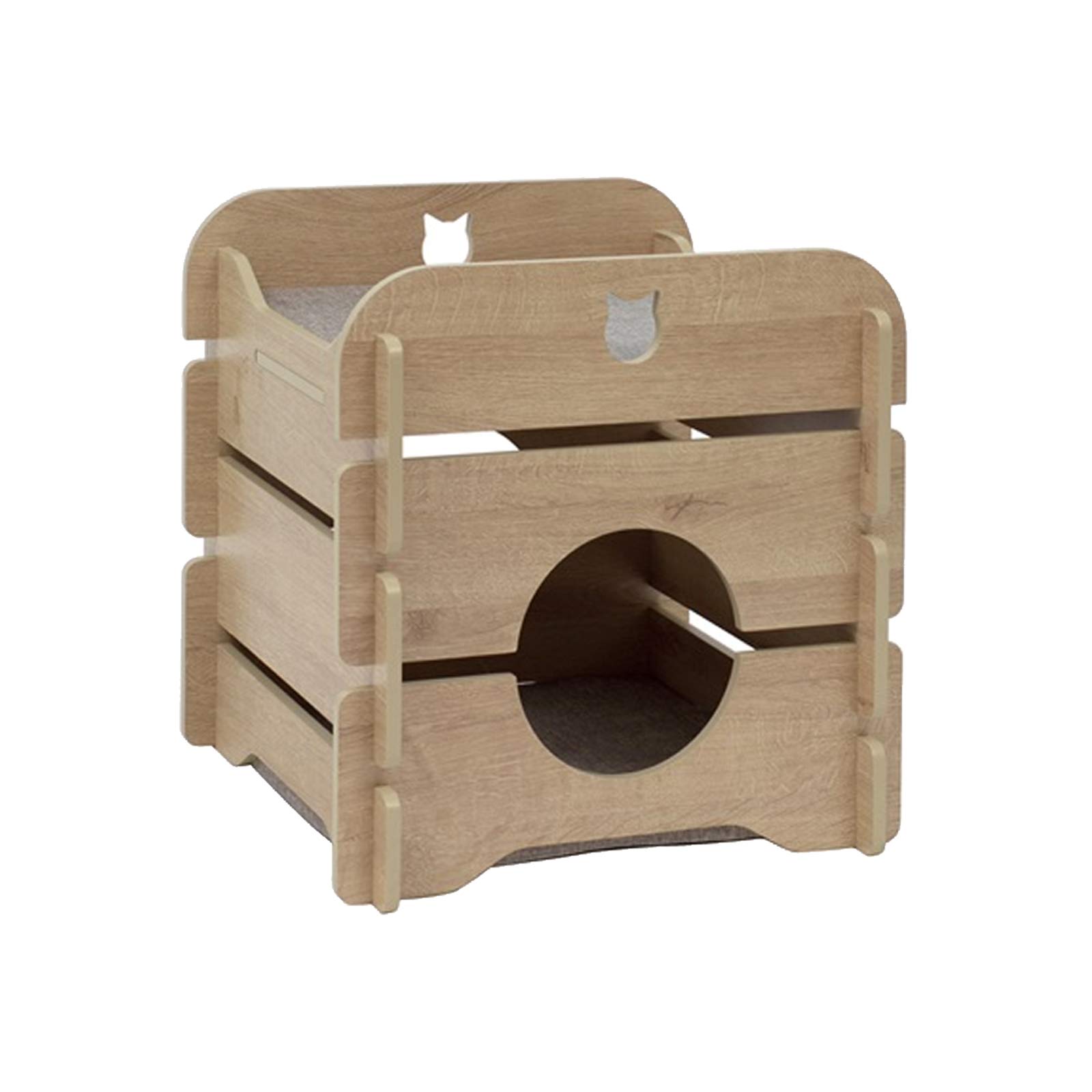 Easy assembly – no tools required Romantic cottage style with cat-shaped decorations Comfortable cat bed cushions, which can be detached and replaced High-quality MDF with oak laminate finish Cozy cat tree hideout with multiple entrances Age range description: All Life Stages