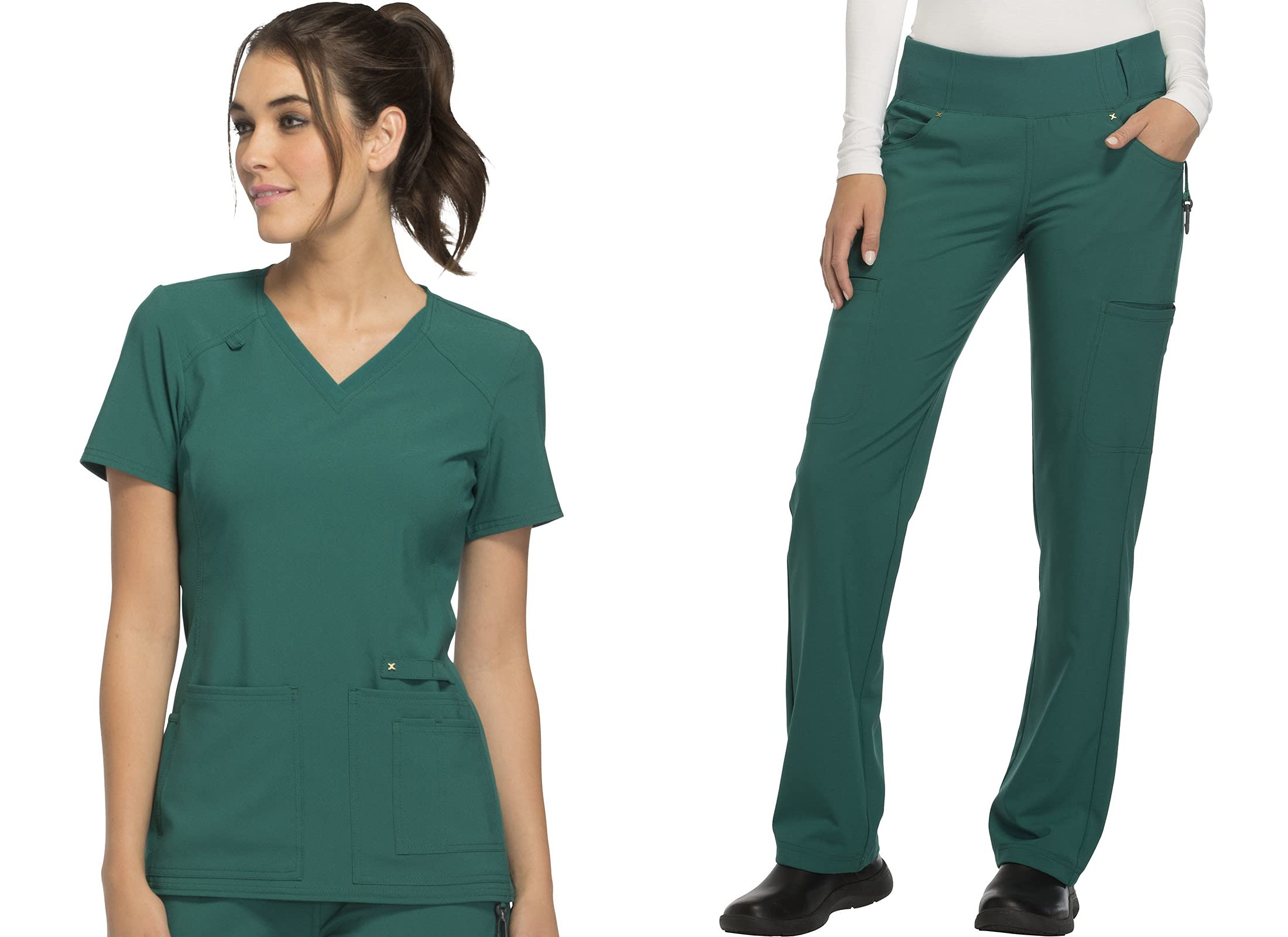 2-PIECE SET - Our Womens scrub set is designed for professionals. Women scrub set are made from lightweight and extremely soft material. Its modern fit, matching v-neck top, and contemporary fit, mid rise, straight leg pants with knit waistband will keep you confident all day long. SPACIOUS POCKET - Our Scrub set for women is perfect in the medical field. The top has 4 pockets two front patch pockets, a scissor pocket, a right hip pocket, with an instrument loop. Our Pant has 6 pockets which include round pockets with signature logo rivets, logo tape with plastic key clasp, two welt cargo pockets, a hidden waistband pocket, a coin pocket, and a flat bungee cord at each leg hem for adjustability. QUALITY FABRIC - Cherokee scrub is made of high-quality fabric which ensures a comfortable fit in the workplace made up of 94% polyester and 6% spandex crosshatch dobby providing a 4-way stretch ensuring comfort in those long shifts. STYLISH DESIGN - Style and function go hand in hand with this women's scrub set, Providing healthcare workers with a professional, hardworking, and stylish uniform. Our durability has made this set one of the most trusted uniforms in healthcare today. Scrubs are designed with performance durability, comfort & style in mind. QUALITY AND COMFORT - Get ready for the day with this scrub set. It offers Contemporary design and functionality, providing superior fit and comfort throughout long work days. Cherokee is the most popular medical apparel brand in the world, known for scrubs and footwear that look great and perform beautifully. Since 1995, we've made it our mission to care for people who care for others. Nurses, physicians, and other healthcare professionals have chosen Cherokee to help them look and feel good because we offer a wide range of styles and colors to fit any lifestyle, budget, and taste. The Women scrubs set is designed with a v-neck short sleeves top, providing comfort and relaxation during your busy day. The top and bottom have sufficient pockets so you can carry your essential items with ease. The pants feature mid-rise, straight leg a comfort-fit knit waistband reinforced with inside elastic for extra support.