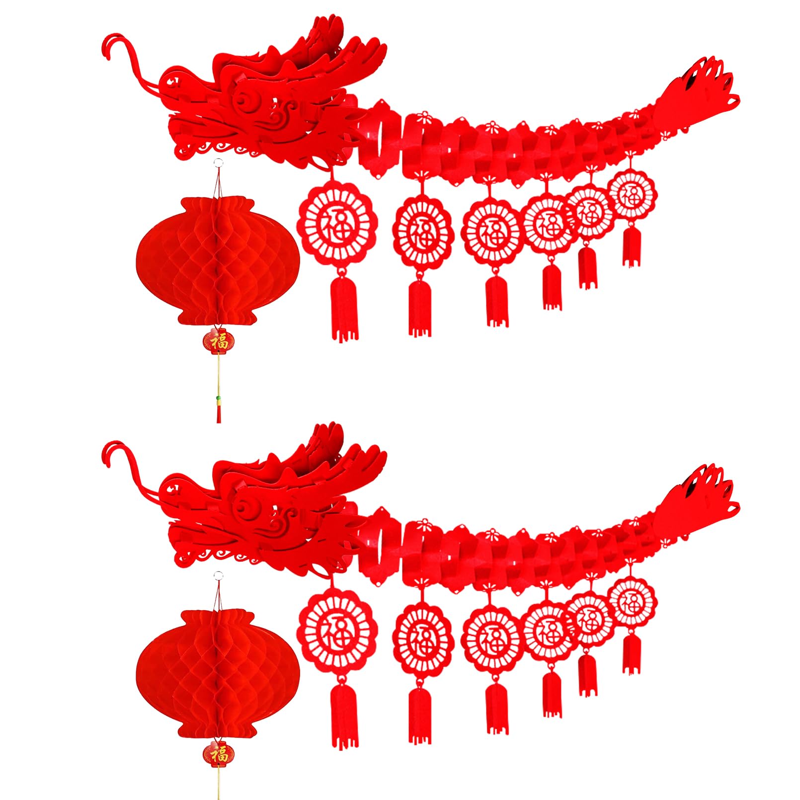 【Package Content】 - There are 2pcs Chinese New Year dragon ceiling decoration and 2pcs Chinese red lanterns in the package, and also contains a instruction. They are all traditional Chinese decoration supplies, perfect to use and share. 【Dragon Decoration】 - Our Chinese New Year dragon decoration has Fu character pendants, hang this paper garland above your entryway to wish everyone Good Luck on Chinese New Year. 【Size】 - The Chinese dragon decoration measures 17 x 170cm / 6.7 x 67inch, and each red lantern is 25cm / 9.8inch in diameter, a great decoration to add to your celebration. 【Festival Decorations】- This Chinese dragon hanging decoration can be hung on windows, doors, ceilings, walls, trees and anywhere you want to decorate to add a festive atmosphere. 【Wide Applications】 - Perfect decorations to add the happiness and peace atmosphere on Spring Festival, Lantern Festival, Christmas, wedding, birthday party or any other special events. 【Package Includes】There are 2 PCS Chinese New Year dragons, 2 PCS Chinese lanterns, and a instruction in the package. These Chinese New Year decorations are great supplies to decorate your house.