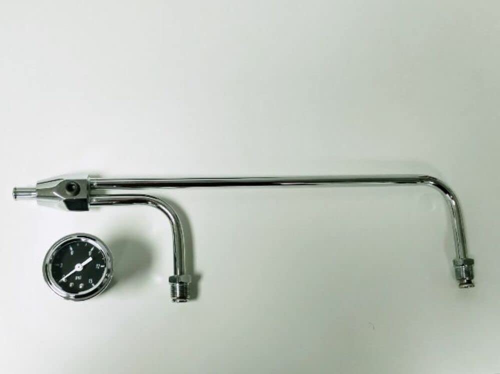 Chrome Steel 3/8" Holley Fuel Line with Black Face Mechanical Fuel Gauge Fuel Line Fits All 3310 Series Holleys with 8-21/32" center to center fuel bowls 3/8" Hose Barb Inlet 1/8" NPT Gauge Port Gauge Is Black Faced 1-1/2" Diameter 0-15 PSI Chrome 3/8" Fuel Line For Holley 3310 Series Carbs w/ 1-1/2" 15 PSI Black Gauge