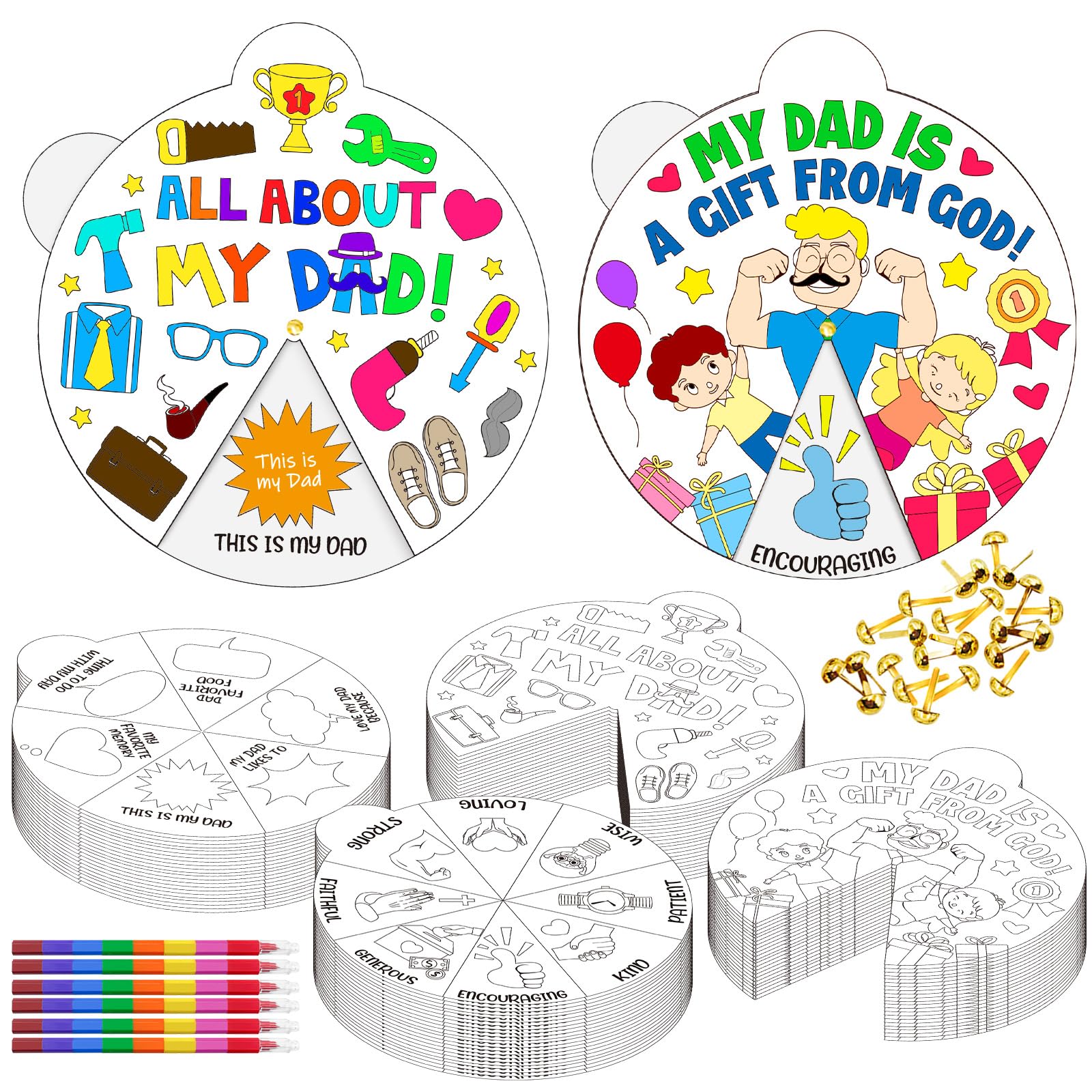 Father’s Day Spinner Crafts: You will receive 48 Father’s Day themed coloring cards, 2 different patterns, 12 cards each, 30 pins for assembling the cards to spin them, 6 8-color assembleable crayons. Enough quantity for children to start creating and express their love for their fathers Suitable size: Each best dad coloring card measures about 9.56x 8.66 inches, with enough coloring space, suitable for children's small hands to grasp, suitable for putting into Father’s Day gift bags or showing each child's best dad in the classroom Sturdy material: This Father’s Day coloring craft set is made of hard thick cardboard, not easy to break, clear printing, can be colored as needed, and not easy to show through the back. This is a craft that children can use with confidence Easy to assemble: Our Father’s Day craft set has 30 push pins, which can be used for assembly directly. You just need to prepare the cards and thumbtacks, pass the thumbtacks through the punched cards, open the thumbtacks, and you can get a beautiful Father’s Day gift Wide Application: Father’s Day Wheel Art Cards are suitable for DIY craft activities in schools on Happy Father's Day, and are also suitable for family gathering activities, or for students to use in school craft classes, allowing children to enjoy the fun of creation Best Gift for DAD These craft kits promote creativity and create truly interesting fashion gifts, collectibles, and Father’s Day party gifts. They are suitable for giving to dear dad on any holiday. They are the best choice for Father’s Day, father's birthday, Independence Day, and party gifts