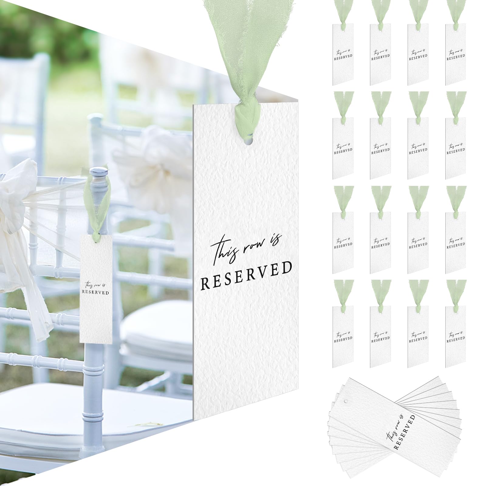 Package Includes: each package includes 12 reserved table signs with ribbon, ensuring you have enough to accommodate all your special guests; Use our reserved row seating signs to enhance your wedding or event decorations and ensure your special guests are front and center Stylish Design: our reserved seating signs for weddings boast an elegant and fashionable design, adding a classy touch to your wedding decorations; The sage green ribbon hanging from each sign enhances this stylish aesthetic, catching the eye and pleasing the senses Suitable Size: each seat reservation card measures 7.9 x 2.4 inches, the text on the label is clear and easy to read, Ensure your guests find their reserved seats with ease; The ribbon measures 18 inches in length and 1.2 inches wide, making it easy to hang and visible from a distance High-quality Material: these wedding seat reservation cards are made of handmade hammered paper, which has a special three-dimensional texture and vintage effect; Both sides of the card are printed with " this row is reserved" ; The ribbon is made of torn chiffon edges, adding an elegant and high-end temperament to the wedding Versatile Applications: with their ideal size and elegant ribbon, these wedding reserved seating signs can be easily hung on chairs, benches, doors or windows; They're not just for tables; Reserve any area for your important guests with these versatile signs Features: Hospitality Signs: By clearly designating reserved seating, our signs help create a smooth, welcoming environment for your guests. They'll appreciate the consideration, knowing exactly where to sit without any confusion or stress, enhancing their overall wedding experience. Effortless Setup: The included ribbons make these signs simple to hang wherever needed, saving you time on your special day. Just loop the ribbon around the spot and your reserved seating is clearly marked. Specifications: Material: paper and ribbon Color: Reserved table signs: white Ribbon: sage green Size: Reserved table signs: 7.9 x 2.4 inches Ribbon: 18 x 1.2 inches Package includes: 12 x Reserved table signs with ribbon Notes: Manual measurement, please allow slight errors on size. The color may exist a slight difference due to different screen displays.