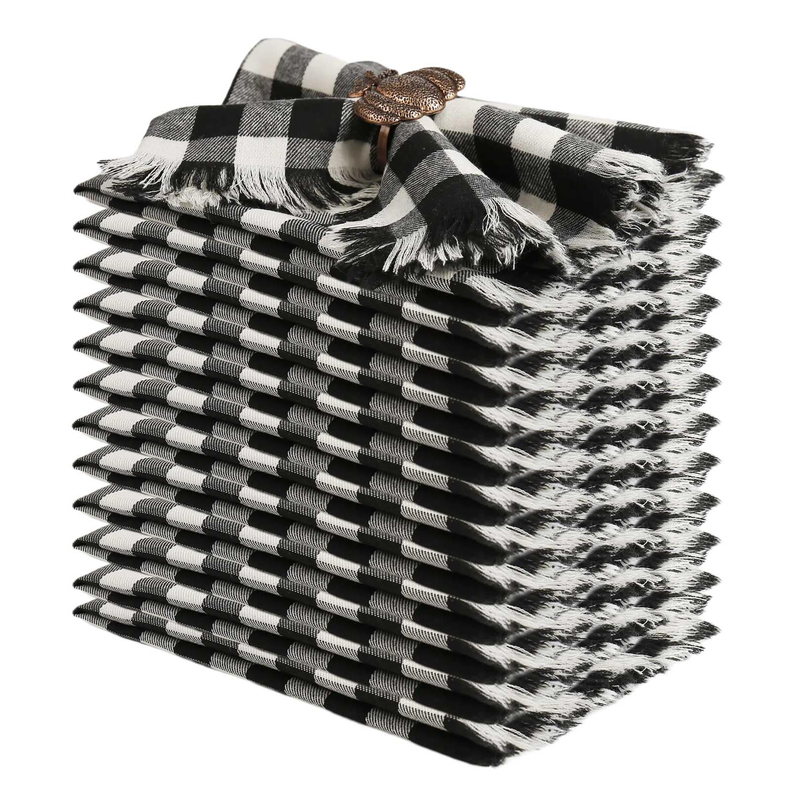 These buffalo check cotton napkins with fringe are versatile dining essentials, adding rustic charm and timeless elegance to any occasion. Whether it's a casual family dinner or a sophisticated holiday feast, they seamlessly blend into various settings from laid-back picnics to formal dinners at home. Their classic buffalo check pattern ensures year-round style, making them perfect for both everyday use and special gatherings. Crafted for seasonal adaptability, these napkins bring a fresh and vibrant feel to spring and summer gatherings, enhancing outdoor events and garden parties with their cheerful design. As autumn and winter approach, their warm and cozy appearance becomes the perfect complement to festive dinners and indoor celebrations. From sunny barbecues to cozy holiday meals, these napkins effortlessly adapt to each season, becoming a staple in your dining decor. Stand out with their handcrafted fringe detail, these napkins showcase artisanal craftsmanship that adds an elegant texture to your table setting. Each fringe is carefully crafted for uniformity and quality, enhancing the napkins' visual appeal and ensuring durability over time. This attention to detail not only enhances their decorative value but also underscores their quality and longevity. Perfect for holiday festivities, these napkins elevate Christmas dinners, Halloween parties, and Thanksgiving feasts with their classic buffalo check pattern and artisanal fringe. They bring timeless elegance to your holiday table decor, creating a warm and inviting atmosphere for family and friends to gather and celebrate. Whether it's adding a festive touch to Halloween or a cozy feel to Thanksgiving, napkins enhance the ambiance with their charming design and high-quality craftsmanship. Crafted from 100% cotton, these napkins offer luxury, durability, and exceptional comfort. The natural cotton fibers provide a soft and luxurious feel, making them a pleasure to use and touch. Whether you're using them daily for family meals or reserving them for special occasions, these napkins uphold their high standards of quality and functionality, making them a versatile and indispensable addition to your dining essentials. Hand wash only, kindly use a laundry bag if wash in the machine Classic Buffalo Checks Cloth Napkins with Fringe Set of 12, 17x17 Inches 100% Cotton Farmhouse Napkins, Soft&Reusable Napkins for Daily Use Halloween Christmas Decor