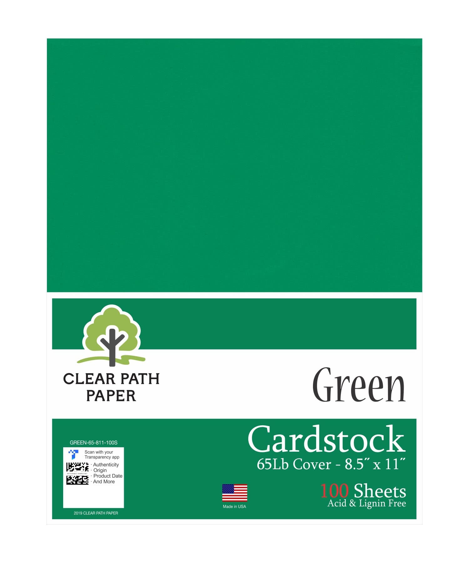 SOLID CORE - Green Cardstock - 65Lb Cover - Easy to score - Cuts and folds cleanly Lignin and Acid Free Scrapbook Paper for great, long-lasting results Fits most Plotter Cutting Machines - Inkjet and LaserJet Compatible More accurate on-screen color matching - All packs include a FREE Color Swatch Card. Made in the USA Thank you for considering Clear Path Paper's Green Cardstock - 8.5 x 11 inch - 65Lb Cover - 100 Sheets for your craft project.