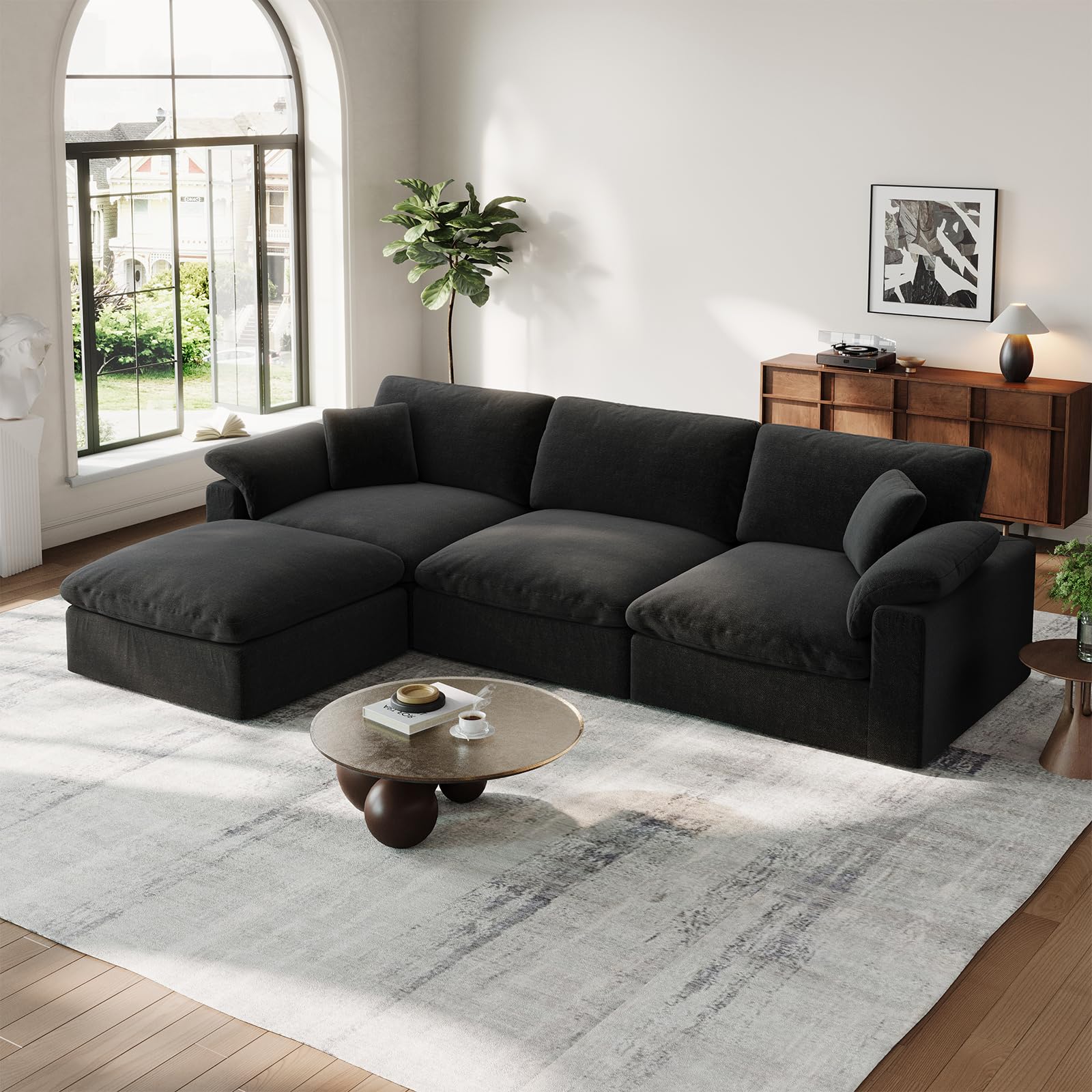 【Comfy Linen Blend Fabric】This cloud sectional couch is crafted from high-quality linen-blend fabric. Not only is this modular sofa soft and comfortable, but it is also highly durable, designed to withstand wear and tear over time.In addition, this sofa is pet-friendly and suitable for family use. 【Stable & Durable Construction】This versatile modular sofa features a solid wood frame for solid construction and durability. Each seat has a weight capacity of up to 440 pounds, providing solid support without caving in. 29.9" of extra-deep seating depth, whether you're lounging or stretching out, you'll enjoy spacious comfort and unfettered moments of relaxation. 【Cozy & Fluffy Cushion】The cushions of this sofa are a distinctive feature, filled with 30% high-resilience foam and 74% down, ensuring optimal softness and comfort. In addition, an extra layer of high-quality foam is added between the cushions and the wooden frame. Our aim is to ensure that everyone who sits on this sofa enjoys a cloud-like comfortable experience every day. 【Washable Sofa Covers】The sofa cover is designed to be easily removable and washable, ensuring maximum convenience for upkeep. For quick cleaning or deep washing, simply remove the cover to keep your living room sofa fresh and tidy.Sofa type: sectional couch sofa; modular sectional; modern sofa; linen sofa;down sofa,sofa sectionals for living room; living room couch; cloud couch dupes; comfy couch;modern couch.This cloud sofa can add more comfort to your living room. 【Versatile Usage】Elevate your space with a sleek, linen-blend modern sofa—perfect for bedrooms, living rooms, apartments, or lofts. Our sofa beds easily adapt to any setting. Whether you're relaxing after a day at work or enjoying a coffee with friends, this sofa will add a warm touch to your home's ambiance. Bring ultimate comfort and versatility to your living room with this Modern L-Shape Modular Sectional Sofa. Perfect for the living room, studio, apartment, this couch offers a free combination setup, allowing you to arrange it as per your aesthetic preferences and space constraints. Designed for optimum comfort, our cloud couch features a deep seat with high-quality sponge filling and down feather cushions, enabling you to lounge in luxury.