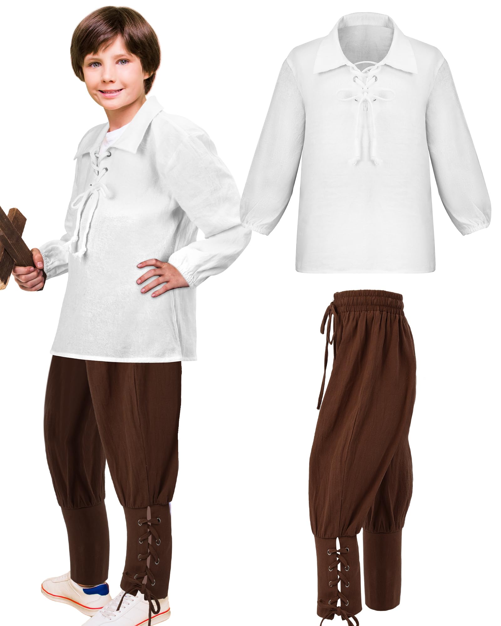 Package Included: this boys pirate costume package includes pirate white shirt and ankle pants, enhancing your overall image to resemble a true pirate, which is ideal for costume parties, Halloween, stage shows, or various themed events Comfortable Material: our pirate outfit is made of linen material, soft, breathable, and durable outfit, without worrying about puncturing children delicate skin; The fabric's texture emanates a vintage atmosphere, perfectly matching the Renaissance medieval costume's authentic vibes Unique Design: this is a medieval and Renaissance style pirate shirt and pants set for kids; Our pirate suit is ideal for achieving a classic pirate look; The shirt features a Vneck with tie-up design to add a sense of fashion, and the pants come with a comfortable elastic drawstring waist and adjustable tie ankles for easy adjust size, so you can move freely and feel comfortable throughout your event Wide Application: this boys renaissance costume can be applied to many occasions, such as pirate party, medieval theme party, Viking role play, Halloween, cosplay, school performances, photography props, Christmas, birthdays, carnivals, daily entertainment; Wear these boys pirate costume and become the coolest little pirate in Halloween events or school performances Variety of Size and Color Options: we offer 3 color options: green, brown, and black, and 2 different sizes to choose suitable for 4-6 years old/ 10-12 years old, you are free to mix and match the outfits; Allowing you to add your personal touch to your pirate costume and enhancing the authenticity of your chosen character Features: Ideal pirate costume: The pirate costume shows distinctive pirate features. When paired with various matching themed props, it brings your overall image closer to a real pirate, allowing you to stand out amongst the crowd. Great for those who love dressing up as pirates or for anyone who enjoys the thrill of role-play. Ideal gift for kids: Brown, green and black sets are available, suitable for 4-6 years old/10-12 years old. Choose the right size and favorite color for your lovely child. The Renaissance pirate costume is suitable for daily wear, which is a flexible addition to your child's wardrobe, and an ideal gift for festivals or birthdays. Specifications: Material: linen Size: as the picture shows Color: white, green, brown, and black Package Includes: 1 x White shirt 4 x Ankle pants Notes: Manual measurement, please allow slight errors on size. The colors may exist slight difference due to different screens.