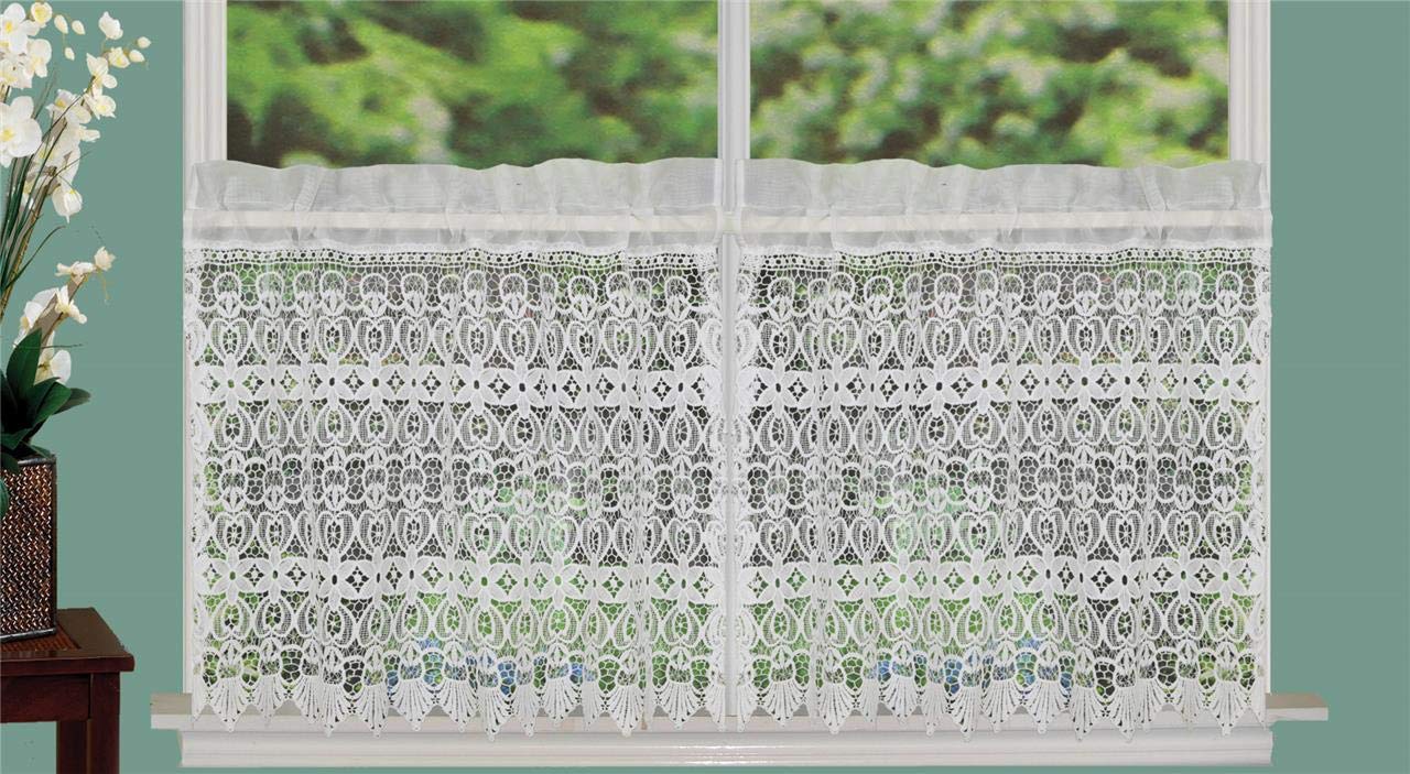 Knitted Lace 24" L Tiers Ivory 1 Pair Each piece measures approx. 30" Wide x 24" Long, with a total width of 60". The sheer header measures approx. 2", and sheer rod pocket measures approx. 2" when it's flat. Machine care. Matching Creative Linens Knitted Lace kitchen curtain valance 60x15" and tailored cafe tiers available It's perfect for everyday use, holidays and special events - Valentine's Day, Easter, Mother's Day, Father's Day, Halloween, Thanksgiving, Christmas, New Year, Anniversary, Birthday, Wedding, House-warming, Bridal Shower, Baby Shower etc. This 100% polyester knitted kitchen curtain pair of tiers has a beautiful knitted macrame lace design spread on it.. The header measures approx. 2", the rod pocket measures approx. 2" when it's flat. Size is approximate due to the knitted feature. This listing has 2 pieces of ivory tiers as shown on picture. Each piece measures approx. 30" Wide x 24" Long, with a total width of 60". Length is from the top to the bottom. Imported. Machine care. Add a bright and elegant touch to your windows in the kitchen, bathroom, dining area, laundry room with Creative Linens Knitted Crochet Lace Window Treatment Collection. It's perfect for everyday use, holidays and special events - Valentine's Day, Easter, Mother's Day, Father's Day, Halloween, Thanksgiving, Christmas, New Year, Anniversary, Birthday, Wedding, House-warming, Bridal Shower, Baby Shower etc.