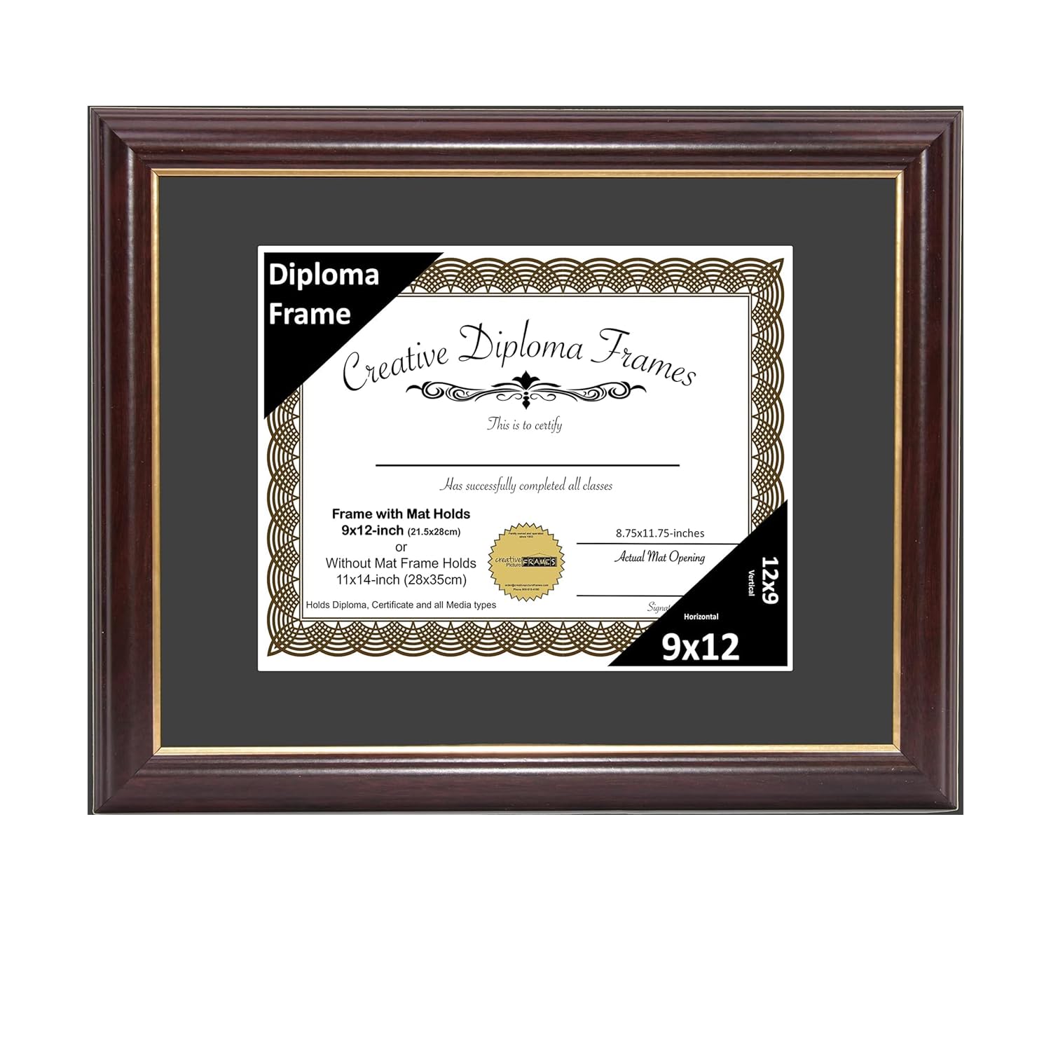 SIZE: Matting holds 9x12-inch document, "cut slightly smaller than your document for mounting" install made easy (8.5"x11.5" mat cut out size) without mat frame holds 11x14-inch document / media STYLE: Mahogany with Gold-inlay 1.25-inch with matting including full strength glass and installed Wall Hanger Expert Craftsmanship: These frames are meticulously made with a focus on quality, precision, and attention to detail, reflecting a tradition of skilled workmanship MATERIAL: Engineered eco friendly moulding