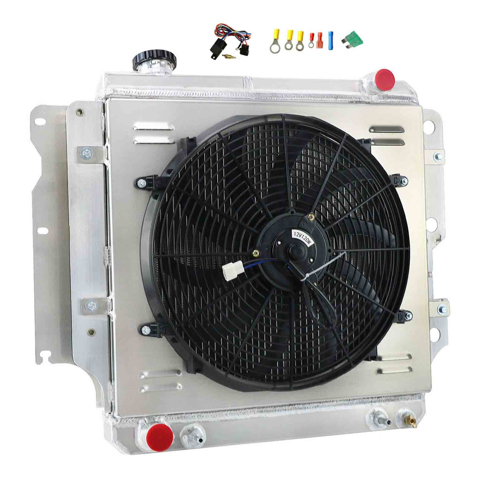 4 Row Radiator with Shroud Fan Relay Kit : Core size: 18.11"H x 20"W x 2.44"T; Overall size: 25.98"L x 23.03"W x 6.29"T; (Measurement standard: the direction of the core strip is high) Upper Inlet : 1.25 inch Passenger Side;Lower Outlet :1.5 inch Driver Side;Transmission Oilcooler:¢26×305×M16 x 1.5(Z) ; Transmission: Automatic and Manual. This Cubauto 4 Row Aluminum Radiator is welded in vacuum brazing furnace, no epoxy, all item is 100% inspected and tested for quality assurance. This Listing Is Including :1 x 4 Row of tubes AA5052 Aluminum Radiator ;1 x CNC machined filler neck and 1.3Bar cap;1 x AA5052 Aluminum Shroud ;1 x 16"120W Fan (Includes fans mounting kits); 1 x Thermostat Relay Kit This all Aluminum Radiator Shroud Fan includes CNC machined filler neck and cap,OEM Style Brass Petcock Drain; Direct OE replacement with drop-in precise fitment and easy installation. ♛Note: 100% Leak Tested, 4 Row Downflow Radiator, Durability Tested ; Warranty : 1 Year ; If you have any questions, please feel free to contact us, we will try our best to help you. Fitment