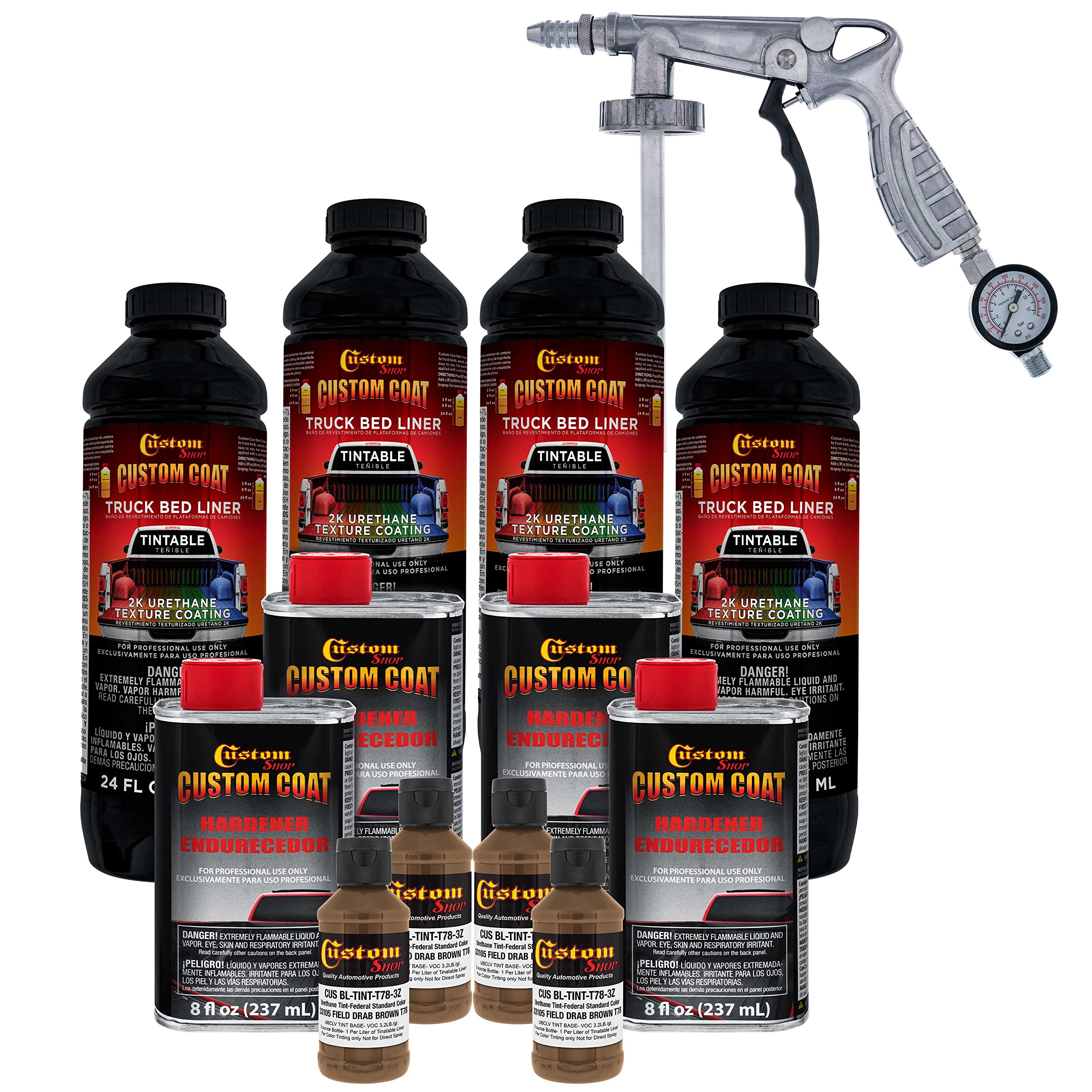 Professional Custom Coat Spray-On Truck Bed Liner 1 Gallon Kit. Custom Tintable Color Kit Includes: 4 - 21 fl. oz. Cans of Tintable Truck Bed Liner Base, 4 - 8 fl. oz. Cans Custom Coat Standard Hardener, 4 - 3 fl. oz. Bottles of Custom Shop Basecoat Color Tint and 1 Custom Coat Applicator Spray Gun with Regulator. Estimated coverage is 110 to 130 square feet @ 10 mils wet film thickness. Custom Coat Truck Bed Liner is a premium durable long lasting textured protective coating that can tolerate extreme climatic temperature conditions. It is heat, UV resistant and waterproof, so it protects coated surfaces from rust. Use it to help dampen sounds and vibrations. Custom Coat was developed to provide a great looking durable yet flexible textured surface and is a heavy duty 2 part urethane coating that is easy to apply. It provides the ultimate surface protection for almost any application. Unlike other protective and bed liner coatings Custom Coat is a flexible material that will resist chipping, while providing impact protection and abrasion resistance. These features and benefits make it perfect for its most popular application as a truck bed liner. Custom Coat is a very versatile product that can be used for endless amount of applications. Use it on truck beds, entire vehicle exteriors, chassis, bumpers, commercial vehicles, equipment and trailers. It's also great for home uses as non-skid coating for floors including garage floors, concrete, wood, steps, walkways, wood decks, docks, bath tubs, basement floors, walls, tool boxes and engine compartments. Easily achieve professional results with our DIY Custom Coat Kit Packages. Kits are available in various sizes from 1 quart to 2 gallon. Kits are also available with either a Spray Applicator Gun or a Paint Roller Application Set. Custom Coat also offers Urethane Tint Concentrate in over 50 colors, so you can choose either a single color or use different colors to create your own multi-colored custom look or use the colors that will make a great camouflage pattern.