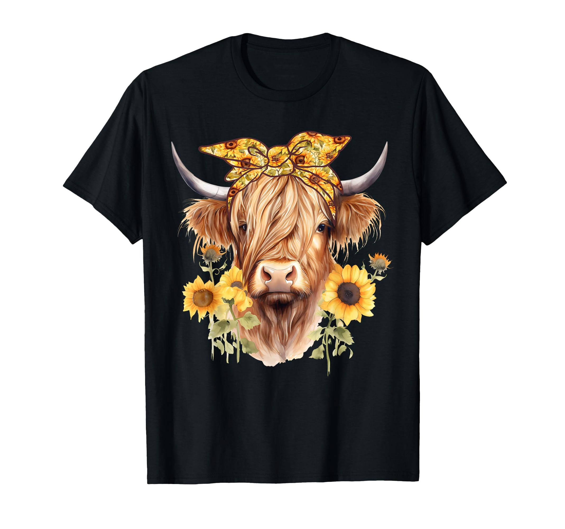 Cute Highland Cow design. Cute Scottish Highland Cow wearing a sunflower bandana within a sunflower field. A great floral heifer design for everyone who loves sunflowers, spring and summer and the Scottish Highlands. Makes a lovely highland cow gifts for women and girls who love floral art and highland cow decor. Lightweight, Classic fit, Double-needle sleeve and bottom hem