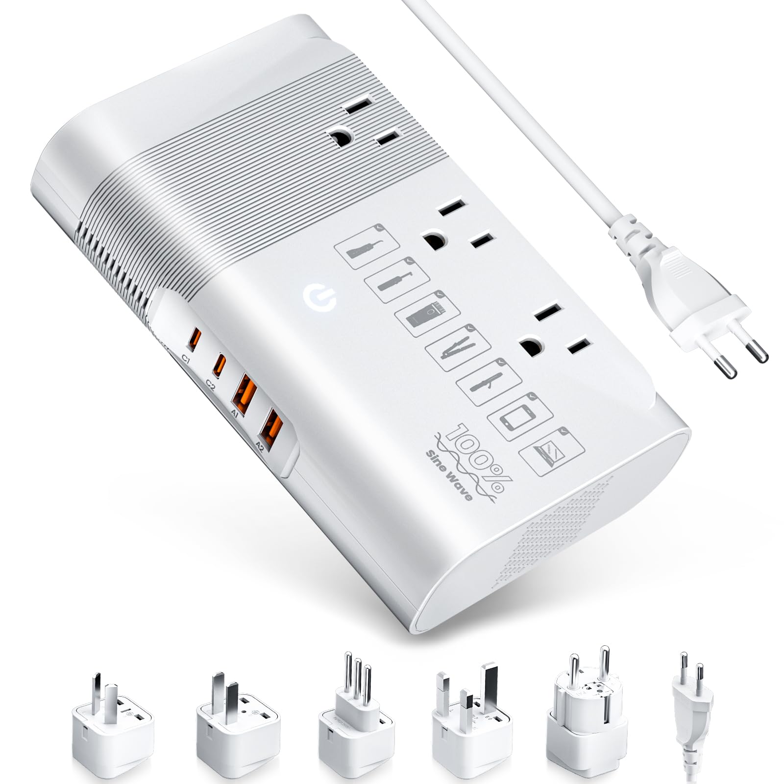 [100% Pure Sine Wave Save Your Devices] Pure sine wave power is a quieter, cleaner, and more reliable power source than you use at home. DOACE Travel Converter can output high-quality pure sine wave voltage to protect your electronic devices, appliances with motors, audio and video equipment, and medical equipment. ☑️ Electronic devices like laptops, phones need pure sine wave to keep them working normaly, minimize potential voltage fluctuations to safeguard your devices' inner electronics, and protect theirs batteries. Laptops charged with pure sine waves have an average lifespan of 50% longer than other wave voltages. ☑️ Medical equipment like CPAP, if you use it to help you sleep, you'll be better off with a pure sine wave converter. Some CPAP warn that it may be damaged by a modified sine wave converter, and others warn that CPAP will work, but the humidifier unit may be damaged! [2024 Protection Design] DOACE converter safety protection includes input under-voltage (low voltage), over-voltage, over-temperature, overload, over-current, and short-circuit protection. If it's overloaded, the switch closes to protect devices from damage, blinking to alert for overload. Then wait for the transformer to cool and reactivate. However, avoid overloading repeatedly as this can damage the circuit and reduce life. ☑️Note: Only for devices under 350W continuous power and 500W start-up power (some devices require more power to start than to sustain, such as hair straighteners). If you're not sure if your device is compatible with our converter, simply try it out before your trip, since DOACE converter always output 110V/60HZ power, supporting use in the US. And if they keep running for 10 mins without heating up, it's OK to put in your travel bag. [Use US Power Worldwide] DOACE voltage converter kit equips 1 EU power cable and 4 international adapters (UK, US, AU, IT). Converts all countries' voltage 100V-240V (60/50Hz) to US Pure Sine Wave voltage 110V (60Hz). So you can use your US devices in more than 160 countries, such as the UK, Europe, Italy, Australia, Italy, Japan, China, etc. Even in US, you can use it as a power strip. [7-1 Fast Charging] DOACE Power Converter features 7 charging ports, including 3 sockets and 4 USB ports. It can charge 7 devices simultaneously at 350W. USB includes 2 PD 20W fast charging USB-C ports and 2 QC 18W fast charging USB-A ports. In addition, USB outputs are completely isolated from AC power for safe device operation. [Travel Essential] DOACE travel power converter has a compact size (6.3✖4✖1.57 in/1.4 pounds) and 4-foot power cable for convenient packing and use. [100% Pure Sine Wave Save Your Devices] Pure sine wave power is a quieter, cleaner, and more reliable power source than you use at home. DOACE Travel Converter can output high-quality pure sine wave voltage to protect your electronic devices, appliances with motors, audio and video equipment, and medical equipment.