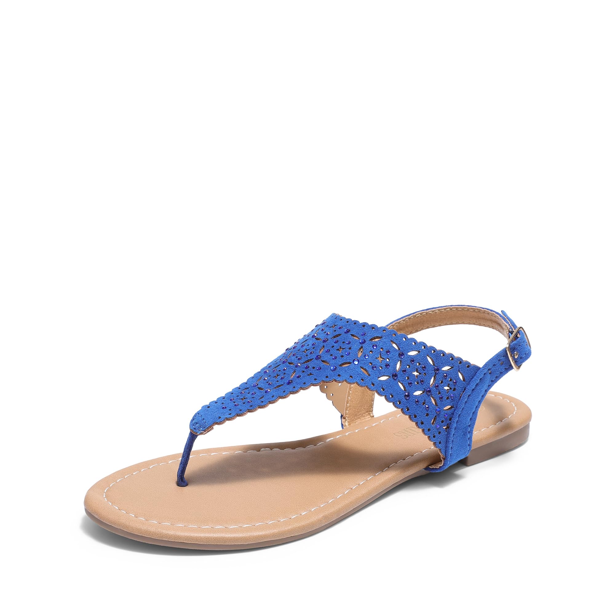 Trendy cutout T-strap design with rhinestone embellishments for modern style Adjustable metal buckle for customized fit Textured outsole provides slip resistance and stability Lightweight and versatile for beach, dates, or casual wear Pairs well with dresses, skirts, shorts, and tees for different looks These T-strap flat sandals are the perfect staple to show off in spring or summer. Featuring a smooth faux leather thong, glittering cutout T-strap, and adjustable metal buckle. Our Dream Pairs flat sandals are an ideal gift choice for the one you love. Tips: True to Size.