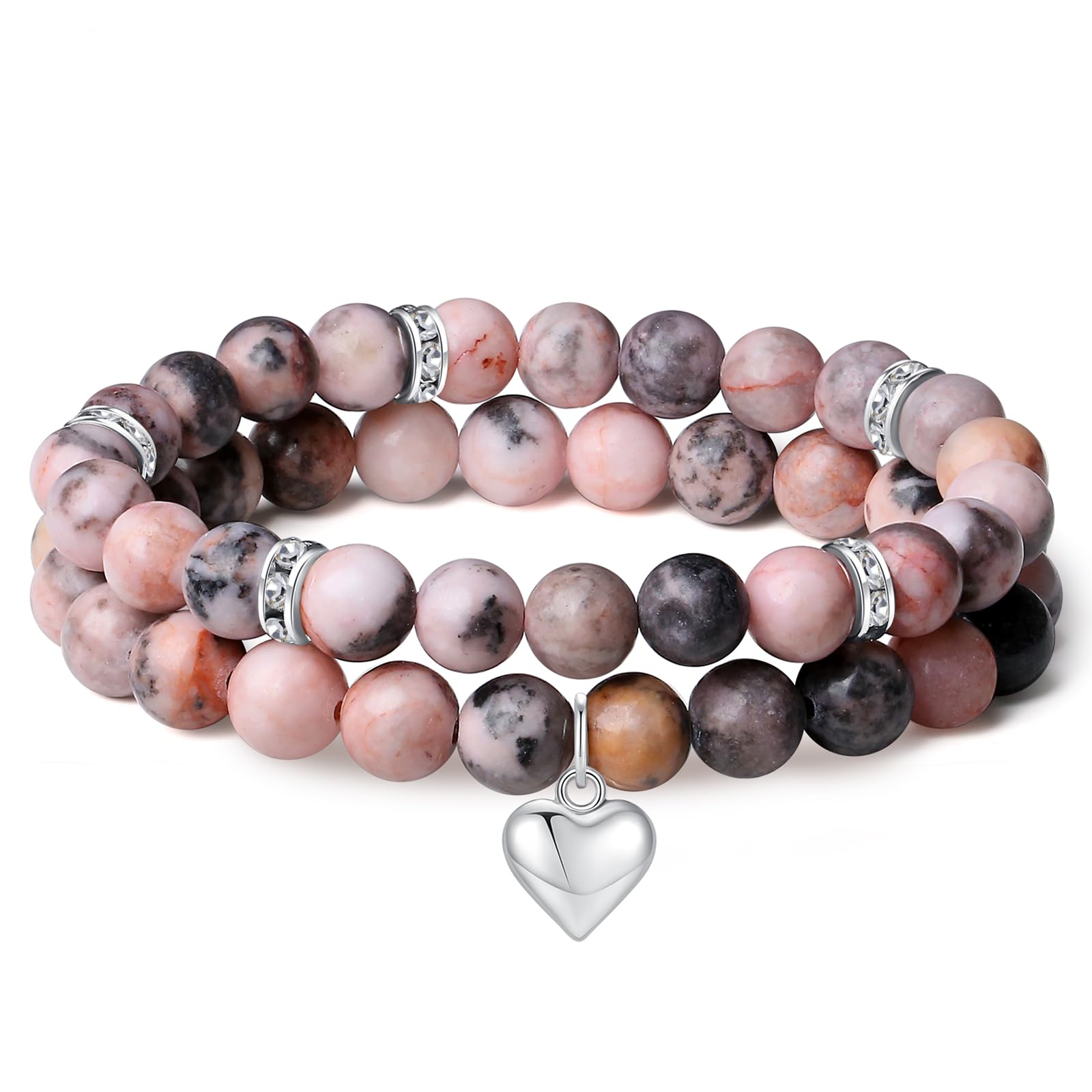 Unique Heart Crystal Bracelet: Heart-shaped gems have romantic qualities and are often used by people to express their love. This zebra gasper pink bracelet with design, fashion, simple, elegant, can adapt to different clothing collocation, in different occasions can be worn Healing Effect: This healing crystal bracelet is made of natural pink zebra jasper, pink zebra jasper is often believed to bring stability, happiness and contentment, it can give people a sense of security. The energy of natural gems can soothe mood, relieve anxiety, do not contain harmful substances, long-term wear is good for health 2Pcs Perfect Gift: The pink zebra jasper bracelet consists of a heart crystal bracelet and a regular beaded bracelet, it can be the perfect gift for someone you care about on a Mother's Day, birthday, Valentine's Day or Christmas to express your love and gratitude. Each crystal bracelet comes with a gift box and bag, suitable as a gift Retractable Bracelet: This natural crystal pink bracelet is strung with a strong elastic band that can be adjusted to comfortably fit different wrist sizes and is easy to slip on and off After-Sales Service: Due to the unique nature of the natural material, the color and texture of the products you receive may be slightly different. If you have any questions or confusion, please feel free to contact us and we will answer your questions within 24 hours DUQGUHO 2Pcs Zebra Jasper Bracelet 8mm Heart Bracelet for Women Pink Bracelets for Women Healing Crystals Jewelry Love Charm Bracelet Natural Stone Crystals Beads Bracelet Gifts for Women