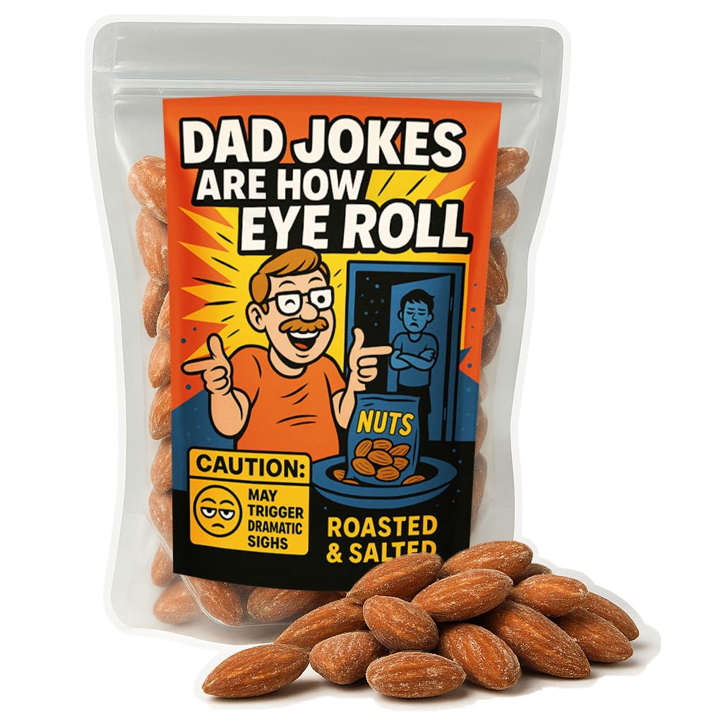 These almonds are for the dad who can't get through dinner without saying "I'm not sleeping, I'm just resting my eyes." Small-batch roasted and lightly salted, they're the perfect snack for groan-worthy puns, awkward silences, and legendary family eye rolls. If your dad starts every road trip with "Let's rock and roll... windows down," he needs this snack. It's salty, bold, and just cheesy enough to match his signature brand of humor. Great for those moments when you laugh and hate yourself for laughing. Perfect for Father's Day, stocking stuffers, birthdays, or just because he texted you a meme you saw two days ago. The label says what you're all thinking: "Dad Jokes Are How Eye Roll." It's snack time with a side of pun. These almonds are made in the USA and roasted to actually taste amazing, because while his jokes might flop, his snacks shouldn't. Pair with a "Pun and Proud" mug or a shirt that says "#DadJokeDealer" and let the cringing commence. The ultimate funny gift from daughter to dad (or son, or niece, or the dog, whatever). Wrap it up in a care package or toss it in a gift bag. He'll love it, pretend he's not crying, then tell you it "nut" to have. Dad Jokes Are How Eye Roll is the roasted almond snack that finally says what the entire family's been thinking. Crafted for the guy who's got a pun for every occasion and a captive audience at every dinner table, this is the gift that brings the laughs, and actually tastes amazing.