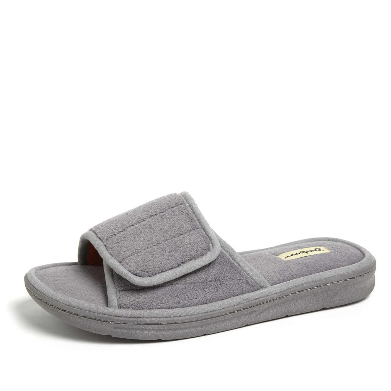 ADJUSTABLE SLIDE SLIPPER: Find the perfect fit, every time! The strong, adjustable hook and loop closure allows for a customized fit, ideal for high insteps and swollen or wider feet. These slippers offer all-day comfort and support with added style. SUMMER SLIPPER: Beat the heat in style! Our open-toe slides boast a breathable terry knit upper that allows for airflow and keeps your feet cool and dry. These summer slide slippers offer unbeatable comfort without sacrificing breathability. DURABLE RUBBER OUTSOLE: Don't let the comfort stop at the doorstep! Our slides feature a durable outsole that provides reliable slip resistance, both indoors and outdoors, and offers underfoot support that keeps you confident with every step. MEMORY FOAM INSOLE: Each slipper is fitted with a multi-density cushioned insole with gel-infused memory foam for a cloud-like feeling on your feet. Plus, increased heel and arch cushioning adds extra comfort for the ultimate in lounging style. MACHINE WASHABLE: Say goodbye to cleaning hassles! Our slides are machine washable for effortless care. Simply toss them in the wash on a gentle cycle with cold water and lay them flat to dry. It's that easy to keep your cozy comfort feeling fresh.