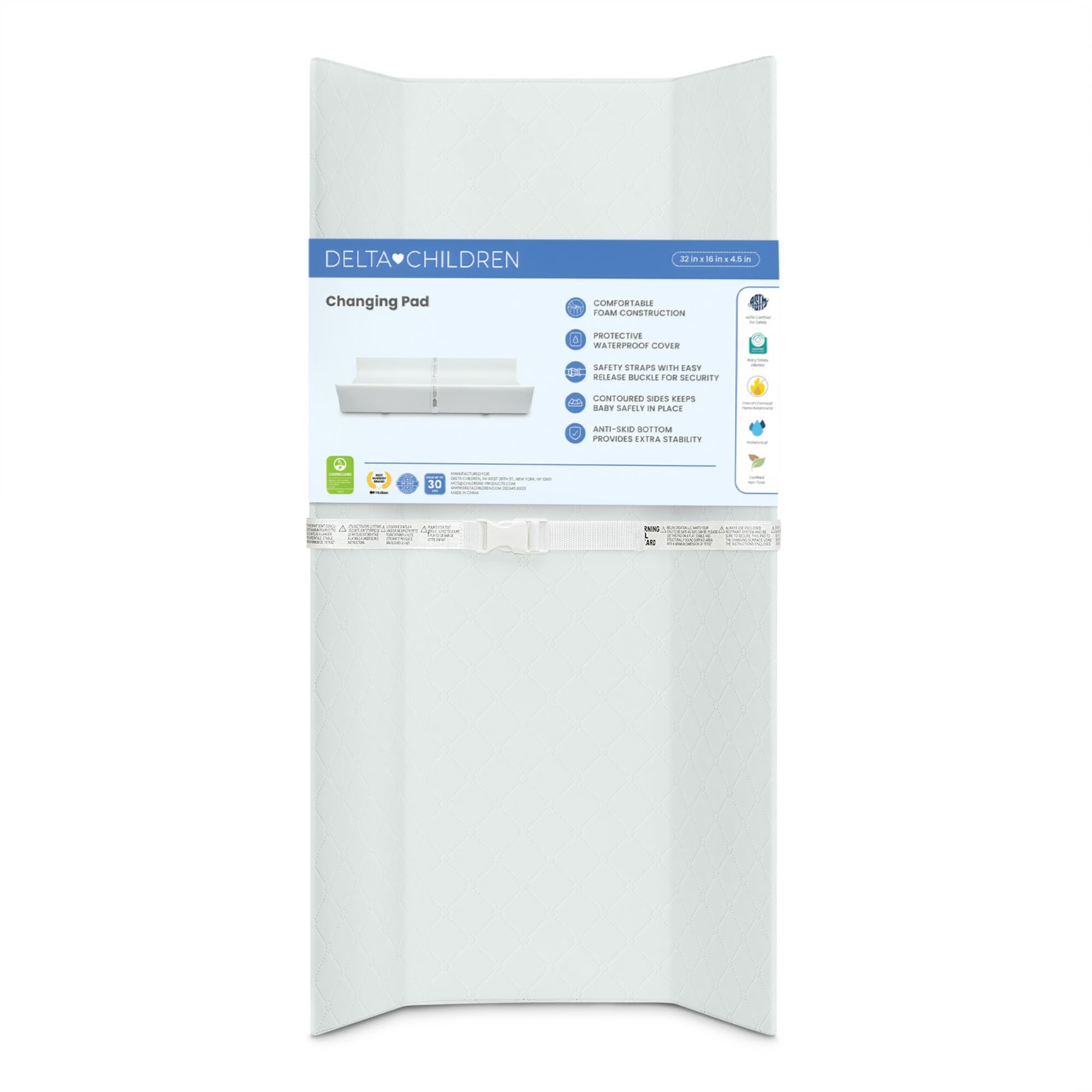 Vinyl Imported Comfy design: The pad's comfy foam construction provides a sturdy surface that helps distribute weight evenly and deliver pressure point relief Waterproof and hypoallergenic: durable vinyl cover is hypoallergenic, removable and 100% waterproof, easily wipe clean with a damp cloth Keeps baby safe: safety harness for baby with a quick release buckle and two contoured sides keep baby securely in place while dressing them or changing their diaper Easy to attach: non-skid bottom ensures changing pad stays securely in place