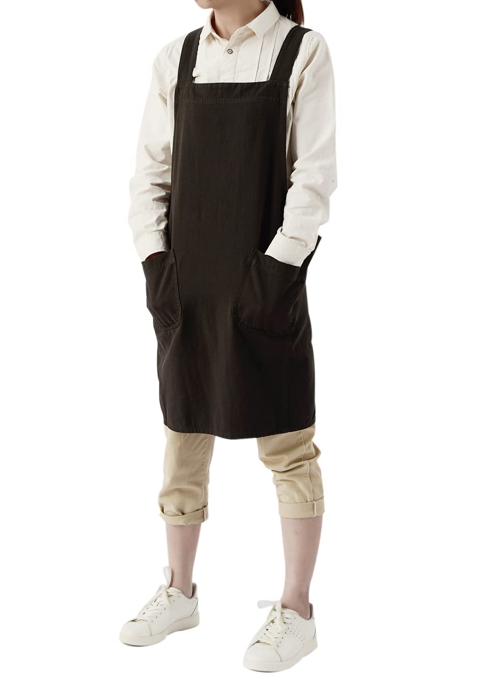 MATERIAL---cotton and canvas. The cotton canvas apron adopts the special process of washing and nostalgic, which makes the apron extraordinary in texture. SIZE---41.3in/105cm wide, 33.4in/85cm long; Shoulder strap length 23.6in/60cm. EASY to CLEAN---Machine wash or hand wash warm with like colors,please note that do not bleach, tumble dry low and warm iron if needed. CROSS-BACK DESIGN---Cross-back design makes this apron convenient to wear and no longer slip from the shoulder. MULTIFUNCTIONAL APRON---The apron not only could gives great protection while cooking, working or trimming the garden, but also just as super cute and fashion clothing collocation to you.It could matche any outfit.Wearing it, you will be praised by many people. TWO LARGE POCKETS---2 pockets on two sides, so easy for holding thermometer, recipe cards, pen, headset etc. SUITABLE OCCASION---Suitable for gardening, high-end cafes, home baking, kitchens, restaurant, coffee shop, bakery, studio, lounge bars,photo studio, hair salon, hotel, etc. Great apron for chores, artist smocks, cutting flowers, DIY , hairstylist, artistic,or even casual outfit. MATERIAL---Washed Cotton.Washed cotton is a high-grade pure cotton fabric, which has the breathability and visual effects of cotton and linen, but retains the softness of cotton, naturally showing a slightly wrinkled effect, reflecting the rustic quality of temperament.SIZE---37in/94cm wide, 32.2in/82cm long(without shoulder strap),;Two Pockets Size:6in/15cmWx 6.7in/17cmL.EASY to CLEAN---Machine wash or hand wash warm with like colors,please note that do not bleach, tumble dry low and warm iron if needed. CROSS-BACK DESIGN---Cross-back design makes this apron convenient to wear and no longer slip from the shoulder.MULTIFUNCTIONAL APRON---The apron not only could gives great protection while cooking, working or trimming the garden, but also just as super cute and fashion clothing collocation to you.It could matche any outfit.Wearing it, you will be praised by many people.TWO LARGE POCKETS---2 big center pockets front, so easy for holding thermometer, recipe cards, pen, headset etc.SUITABLE OCCASION---Suitable for gardening, high-end cafes, home baking, kitchens, restaurant, coffee shop, bakery, studio, lounge bars,photo studio, hair salon, hotel, etc. Great apron for chores, artist smocks, cutting flowers, DIY , hairstylist, artistic,or even casual outfit.PACKAGE INCLUDING---1*Apron