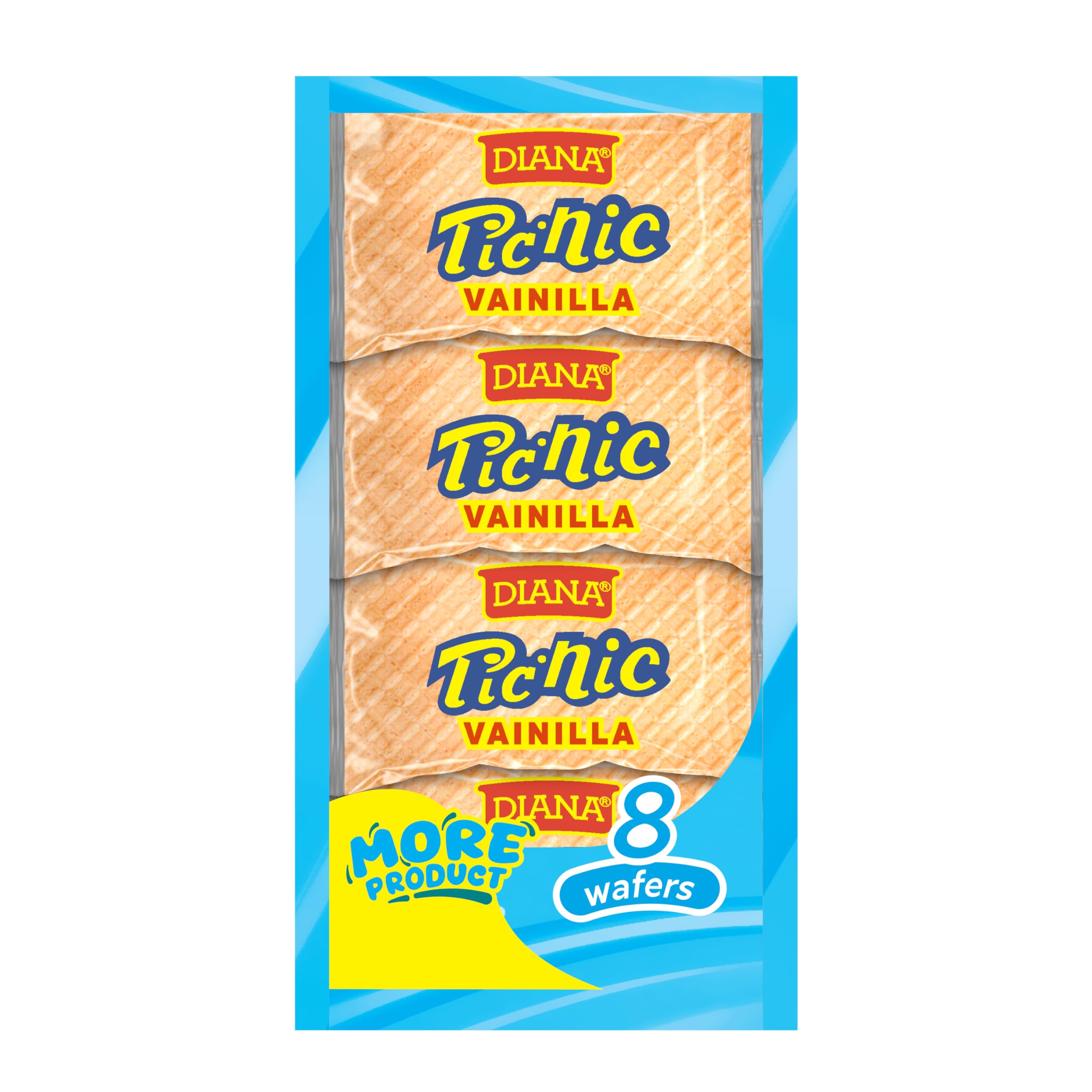 Light and crispy wafer cookies layered with smooth, creamy vanilla flavored filling A classic combination of crispy crunch and sweetness Great for lunchboxes, coffee breaks, or satisfying your sweet tooth any time Individually wrapped for freshness and easy snacking on the go Diana Pic-Nic Vanilla Wafer Cookies have a light, crispy texture with smooth, creamy vanilla flavored filling. The classic combination of crunch and sweetness makes them a satisfying treat any time of day. Pack them in lunchboxes, enjoy them during coffee breaks, or reach for one whenever a sweet craving hits. Each wafer comes individually wrapped for freshness and easy snacking. Popular across Central America, Diana Pic-Nic Wafer Cookies have been a hit with both kids and adults for decades.