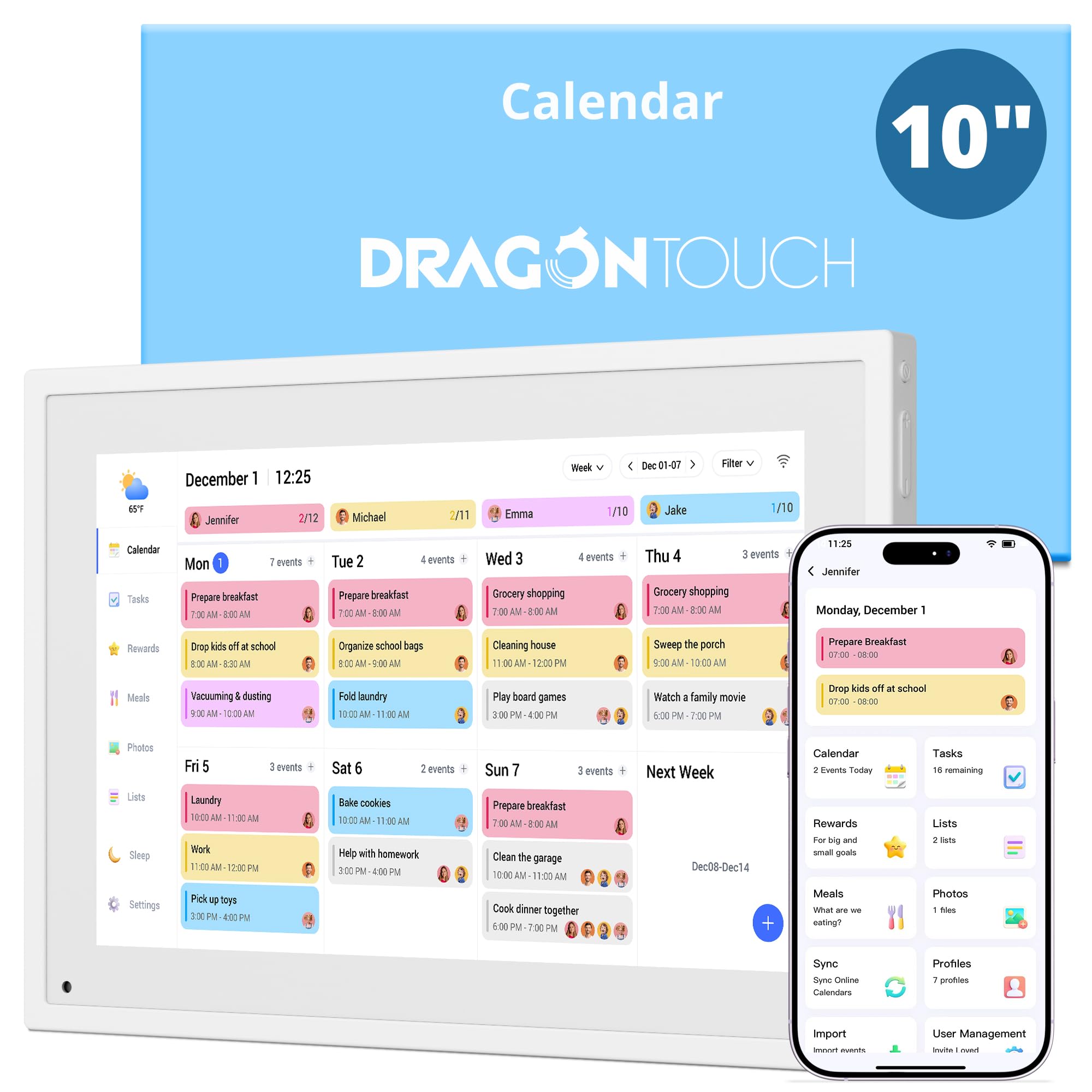 All-in-One Family Organizer:10” touchscreen digital calendar simplifies family scheduling. Create events by role or events, switch between daily, weekly, and monthly views effortlessly. Ideal for syncing everyone’s activities, from school events to work meetings Interactive Task & Reward System:Boost family participation with customizable task and reward interfaces. Assign chores, set goals, and award stars—turn responsibilities into fun challenges that keep kids and adults motivated. Smart desk calendar for smart family life Flexible Cross-Platform Sync Options:Wirelessly sync with Google, Yahoo, and other major calendars via the dedicated app, with the freedom to choose whether to share your schedule or keep it private. Update changes instantly across all devices, ensuring your family stays coordinated while maintaining control over your privacy Dual-Purpose Space Saver:Beyond scheduling, enjoy 32GB of storage for digital photos. Transform electronic calendar into an electronic photo frame, displaying cherished memories when not in calendar mode. Sleep function saves energy between uses Effortless Setup, Lasting Convenience:Intuitive touch controls make navigation easy for all ages. Compact yet feature-rich, this calendar planner streamlines family life, helping you manage time, share schedules, and create routines with ease