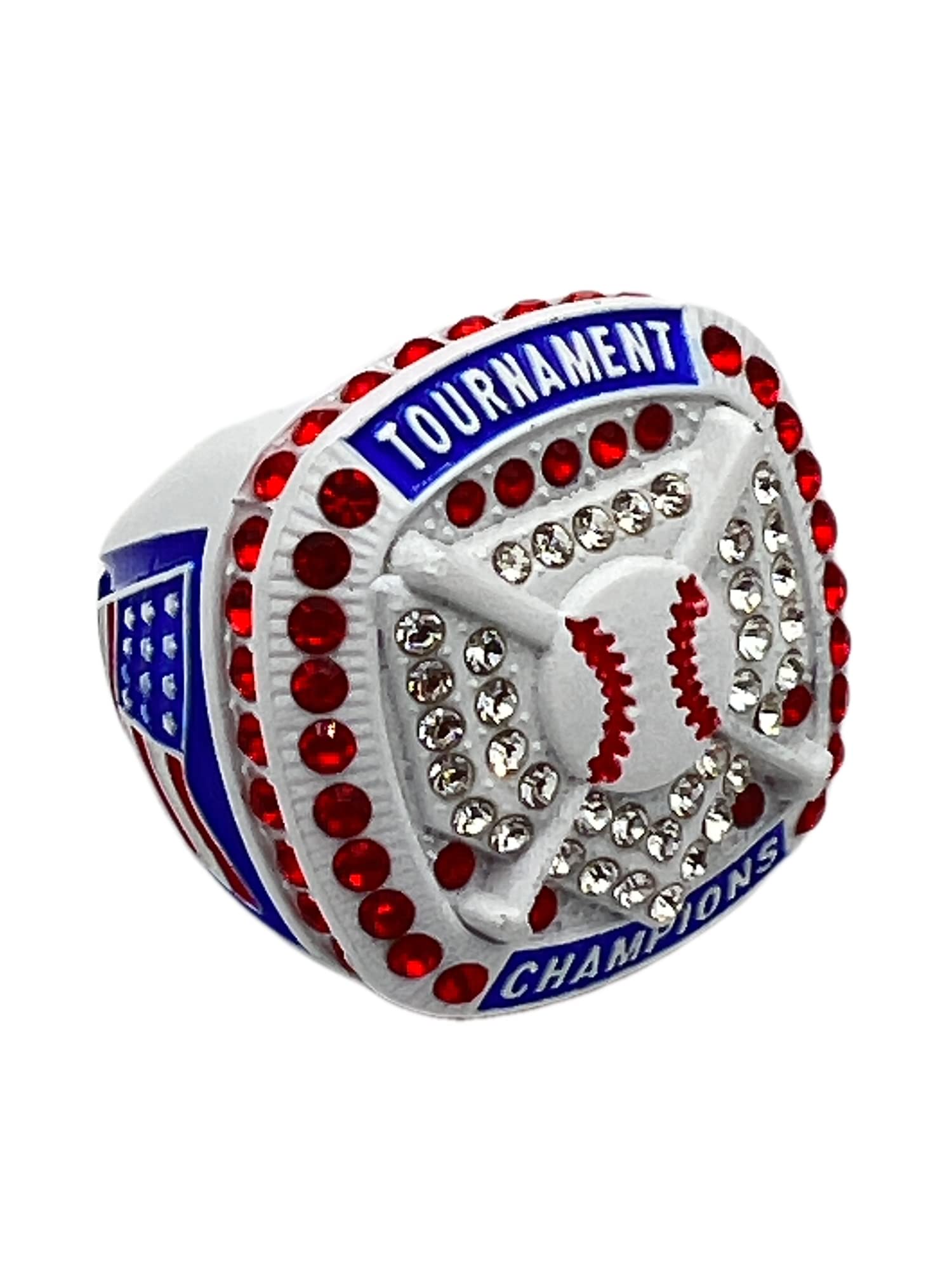 HIGH QUALITY DESIGN: Championship Rings Are Great Stand Out Awards For Your Team, Leagues and Tournaments Size : From US Size 9, Fits Youth age 6-15 Wooden Box sold Separately Gift : Great Gift For Sports Fan. Feel Free To Exchange Or Return It If You Do Not Love It. RECOGNITION: A Perfect way to Recognize any Player, Competitor, Coach, Sponsor, Team Mom or Dad. Material :Environmental Friendly Zinc Alloy Crystal Stone,Absolutely Solid Ring Not Hollow. This ring is made of a zinc alloy. The ring body is WHITE in color. The stones on the side bezel are RED in color the stones in the top bezel are RED in color. There is BLUE color paint on the sides of the rings. The left side of the ring shows an American Flag and the right side shows a glove with crossed bats in the background. The top of the ring shows a home plate with crossed bats in the background with clear stones and TOURNAMENT CHAMPIONS on the top.