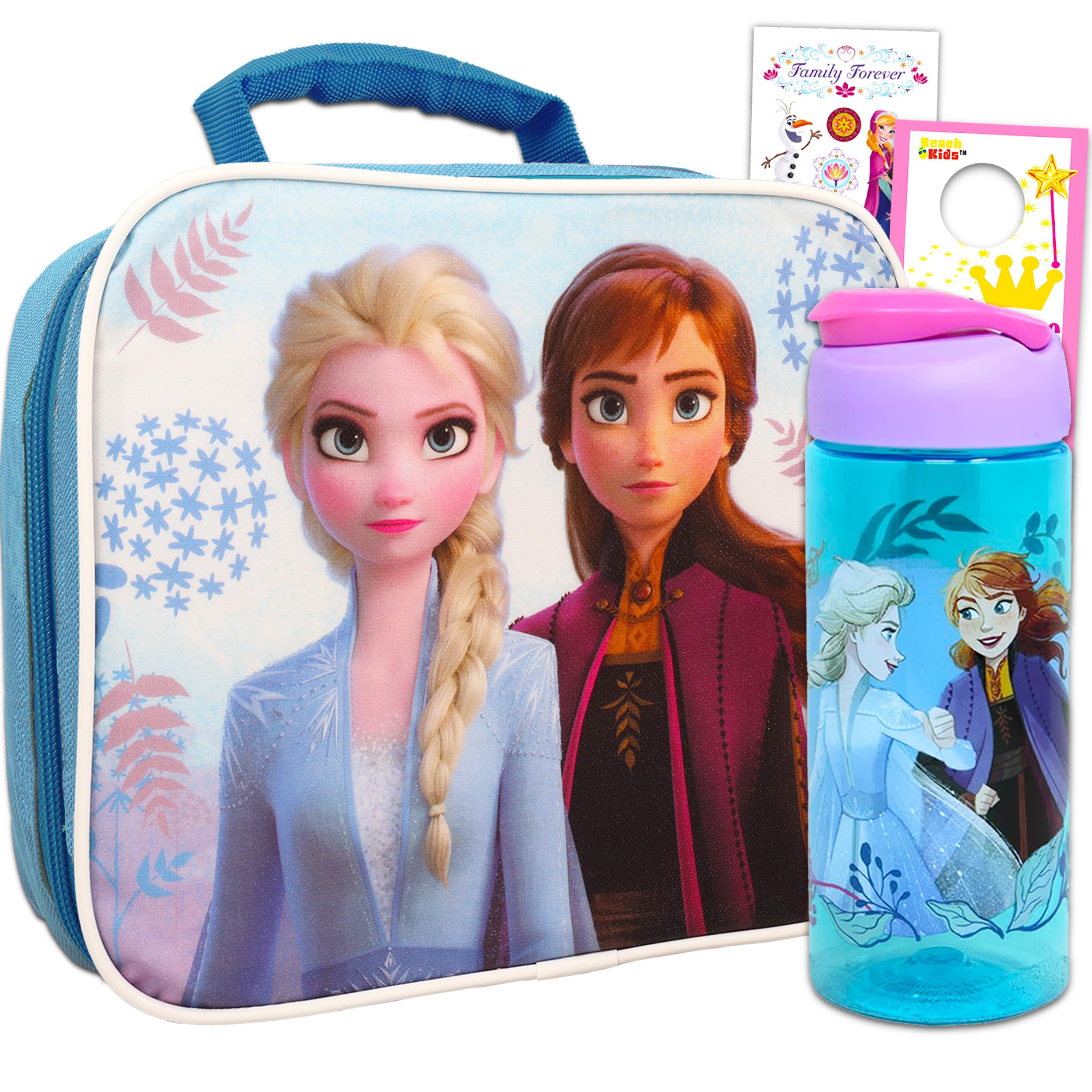 Frozen Accessories (Styles May Vary). The Frozen lunch box and water bottle set comes with one 9 in x 3 in x 8 in, insulated lunch bag featuring Anna and Elsa, as well as one Frozen refillable 16.5oz water bottle! The Frozen lunch bag and water bottle set is the perfect companion for any kid's school day. Keep lunch fresh and stay hydrated with these Frozen accessories and school supplies. Perfect as Frozen party favors at your next Frozen party, the Frozen school supplies set is great for kids of all ages. Kids will love showing off their Frozen school supplies to friends and family alike! Officially licensed Frozen school supplies. The Frozen water bottle and lunch box set also comes with bonus Frozen stickers and a princess castle door hanger!