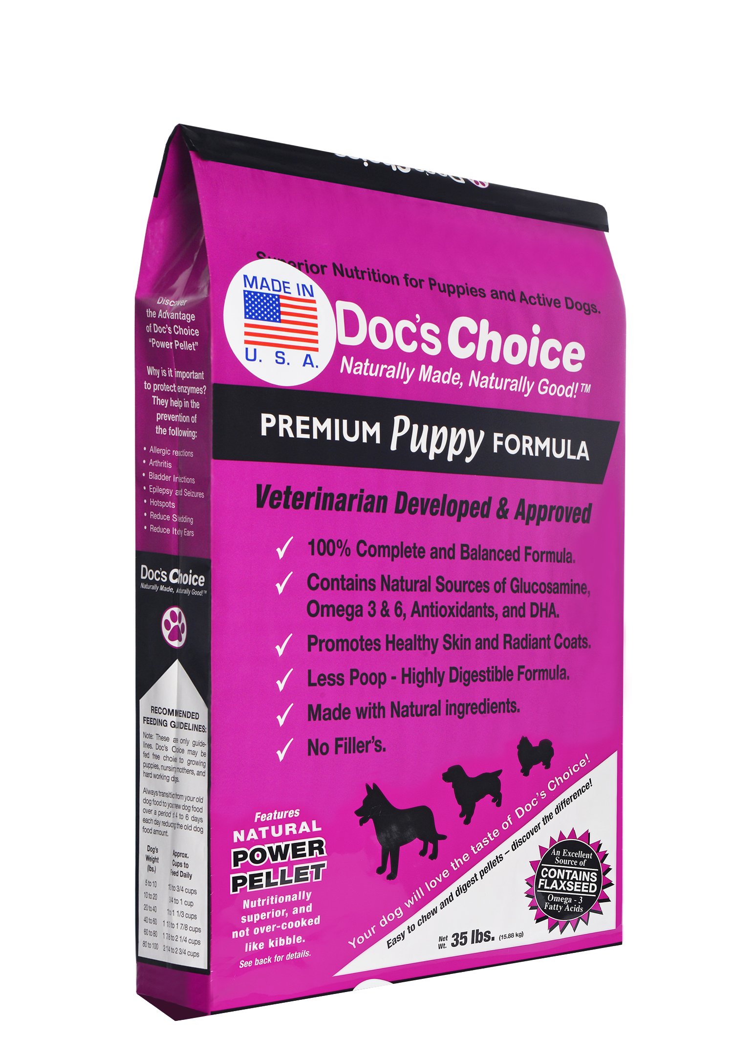 NO ARTIFICIAL INGREDIENTS OR BY-PRODUCTS: Doc’s Choice Premium Puppy Formula provides nutritional excellence for puppies, pregnant or nursing dogs, and highly active adult dogs. The high-quality ingredients used in Doc’s Choice promote healthy bones and muscles, healthy skin and radiant coats, and a strong immune system. Doc’s Choice Premium Puppy Formula contains natural sources of glucosamine and DHA, natural antioxidants, and omega 3 and 6 essential fatty acids HIGHLY DIGESTIBLE: The Doc’s Choice “Power Pellet” process protects the nutrients better than the “Kibbling” process because it exposes the ingredients to fewer heat processes, and the temperatures used in the “Power Pellet” process are lower than the temperatures used in the “Kibbling” process; thus, the heat sensitive vitamins, proteins, amino acids, and enzymes are preserved better. PROBIOTICS & PREBIOTICS: As with the other Doc’s Choice diets, the “Chicken Puppy Food” recipe is made with probiotics and prebiotics for healthy digestion, vitamin and mineral blends to meet your dog’s needs, flax seed for important omega 3 & 6 fatty acids, and many more nutritional ingredients! VETERINARIAN DEVELOPED & MADE IN USA: Doc’s Choice was founded by Dr. Gene Graney more than 30 years ago. Dr. Graney, prior to founding Doc’s Choice, was a practicing Small Animal Veterinarian for 20 plus years, and witnessed firsthand the need for better nutritional pet food. CUSTOMER SATISFACTION: We stand firmly behind our products and offer a 100% satisfaction guarantee. Our USA based customer service team is always ready and available to answer any questions. With a wide range of dog food, we are sure that you'll find a dog food that your dog will love! Doc's Choice "Puppy" formula is a super-premium, all-natural dry puppy food developed by and founded by a licensed, small-animal, USA Veterinarian. The Doc's Choice puppy formula is optimized to promote shiny, soft, and lustrous coats, and its high digestibility promotes smaller and firmer stools! The unique "pelleting" process utilized by Doc's Choice helps protect the vital nutrients in the food, which means more nutrients are available for your puppy! Your puppy will also love the small, easy-to-chew and digest pellets, and he or she will benefit from the Omega 3's and 6's, high levels of antioxidants, the supplemental probiotics and prebiotics, glucosamine, vitamins, and minerals leading to a healthy and balanced diet. You'll also love the fact that Doc's Choice is family owned and operated so we care more about your dog's health and well-being than corporate profits! And, we are proud to say we are made in the USA!