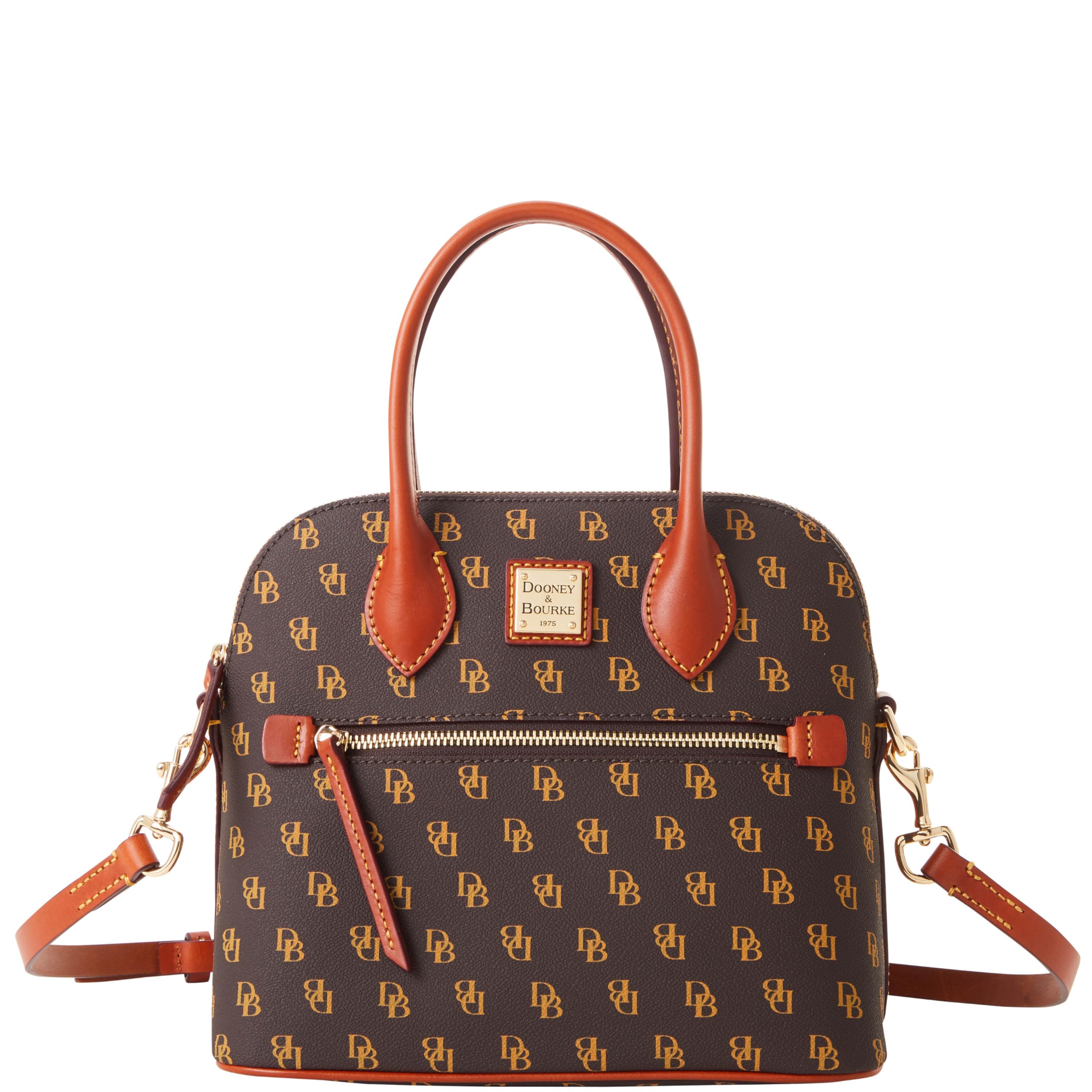With its secure dome shape and signature gold-finished 'Dooney 1975' logo plate, this designer bag ensures your belongings are safely stored while showcasing timeless brand heritage, whether you're headed to business meetings or elegant social events. This versatile domed satchel offers women ultimate flexibility with both top handles for classic carrying and a detachable, adjustable strap for shoulder or crossbody wear. The protective coating on the cotton fabric offers superior resistance to daily wear and tear while the leather trim adds rich contrast and luxury appeal. Its refined structure showcases Dooney & Bourke's commitment to quality craftsmanship and enduring American fashion since 1975, reflecting the brand's dedication to creating leather purses that seamlessly transition from day to night.