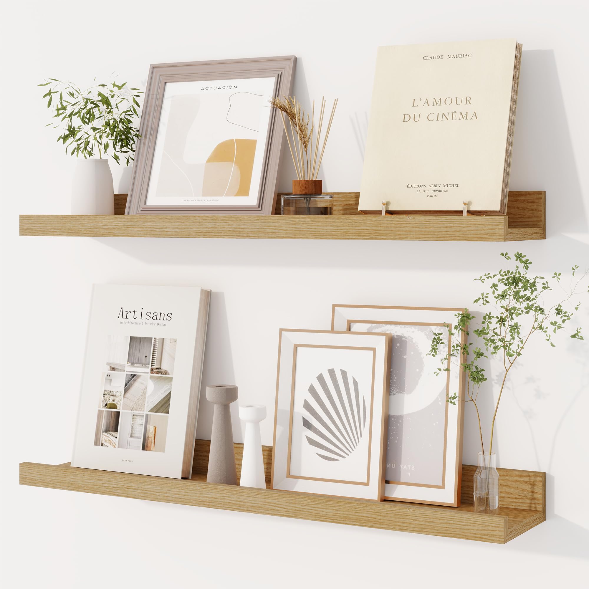 Display Pictures: Do you have a treasure trove of unforgettable photos but struggle to find the perfect way to showcase them? Our picture ledge shelves are the ideal solution! Available in generous sizes, they allow you to display an array of photo frames—all in one stylish place. Say goodbye to clutter and hello to a gallery that tells your story! Practical Design: Crafted with a classic U-shaped silhouette, this wooden floating shelf not only elevates the aesthetic appeal of your space but also ensures your items stay put. No more worrying about accidental bumps—your cherished belongings will remain safe and secure. Versatile Placement: Whether it's your bedroom, living room, bathroom, or kitchen, these wood floating shelves fit seamlessly into any environment. With a variety of sizes to choose from, they serve as chic platforms for your favorite decor pieces while providing handy storage solutions that help keep your countertops and surfaces tidy. Easy to Install: Installing your new shelves is a breeze! Each shelf comes with pre-drilled holes and all the necessary mounting hardware, so you can have them up in a matter of minutes. Just follow the simple instructions, and you'll be ready to display your treasures before you know it. Superior Quality: Each DREAMLAND wood floating wall shelf is designed for durability, ensuring you enjoy its beauty for years to come. Our mounting holes are spaced 16 inches apart for secure installation on wall studs. Plus, the sleek finish on our black and white options lends a contemporary flair, while the oak and walnut colors boast realistic wood grain textures, adding a touch of warmth and sophistication to your decor. 24 Inch Picture Ledge Shelf for Wall, Oak Floating Shelves, Floating Shelves with Lip for Nursery, Living Room, Bedroom, Bathroom, Kitchen, Set of 2