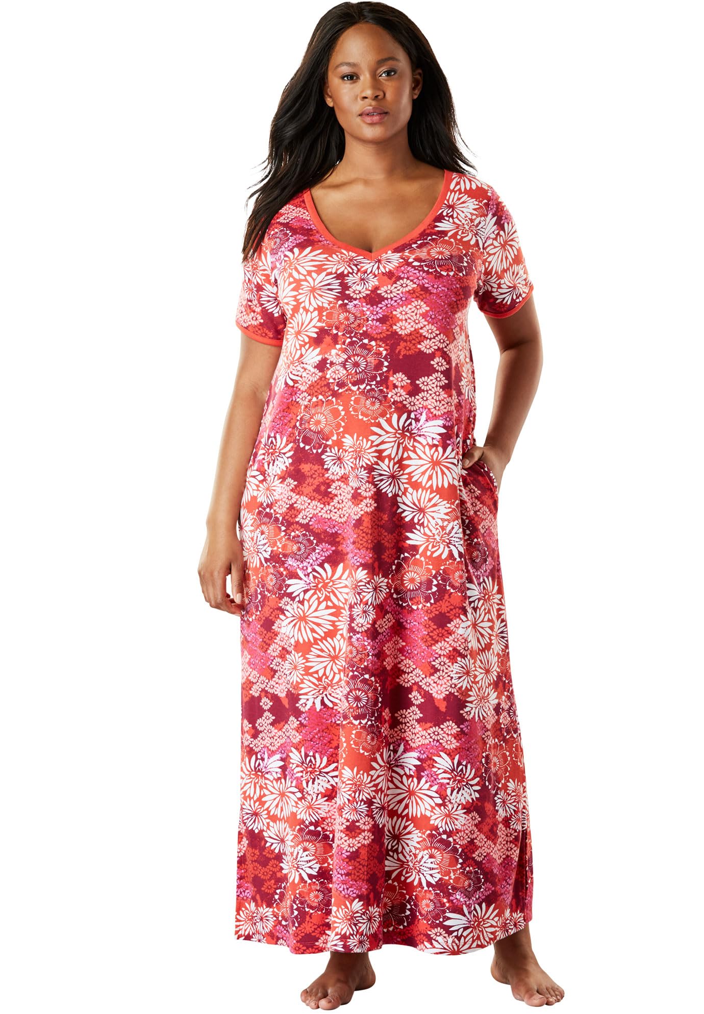 Enjoy ultimate comfort with this delightful lounge dress featuring short sleeves and V-neck. Relaxed fit in a flattering trapeze shape offers plenty of mobility for all-day wear. Maxi length provides added modesty and style for lounging around the house or casual outings. About the brand: Dreams & Co. creates the most comfortable and fun plus size sleepwear & robes with a great selection of prints and solids in sizes up to 8X. For resting, relaxing, and beyond, you'll always find colorful style. br> Enjoy ultimate comfort with this delightful lounge dress featuring short sleeves and V-neck. Relaxed fit in a flattering trapeze shape offers plenty of mobility for all-day wear. Maxi length provides added modesty and style for lounging around the house or casual outings.br>Convenient side pockets for easy storage of small essentials.br>Side hem slits for easy mobility.br>Available in an average length of 52" and a petite length of 48" to suit your style perfectly.br>Crafted from a soft cotton/poly blend for a comfy feel all day long.br>Easy care, machine washable for your convenience.br>Complete your cozy look by pairing it with some snug slippers and a soft robe.br>Imported