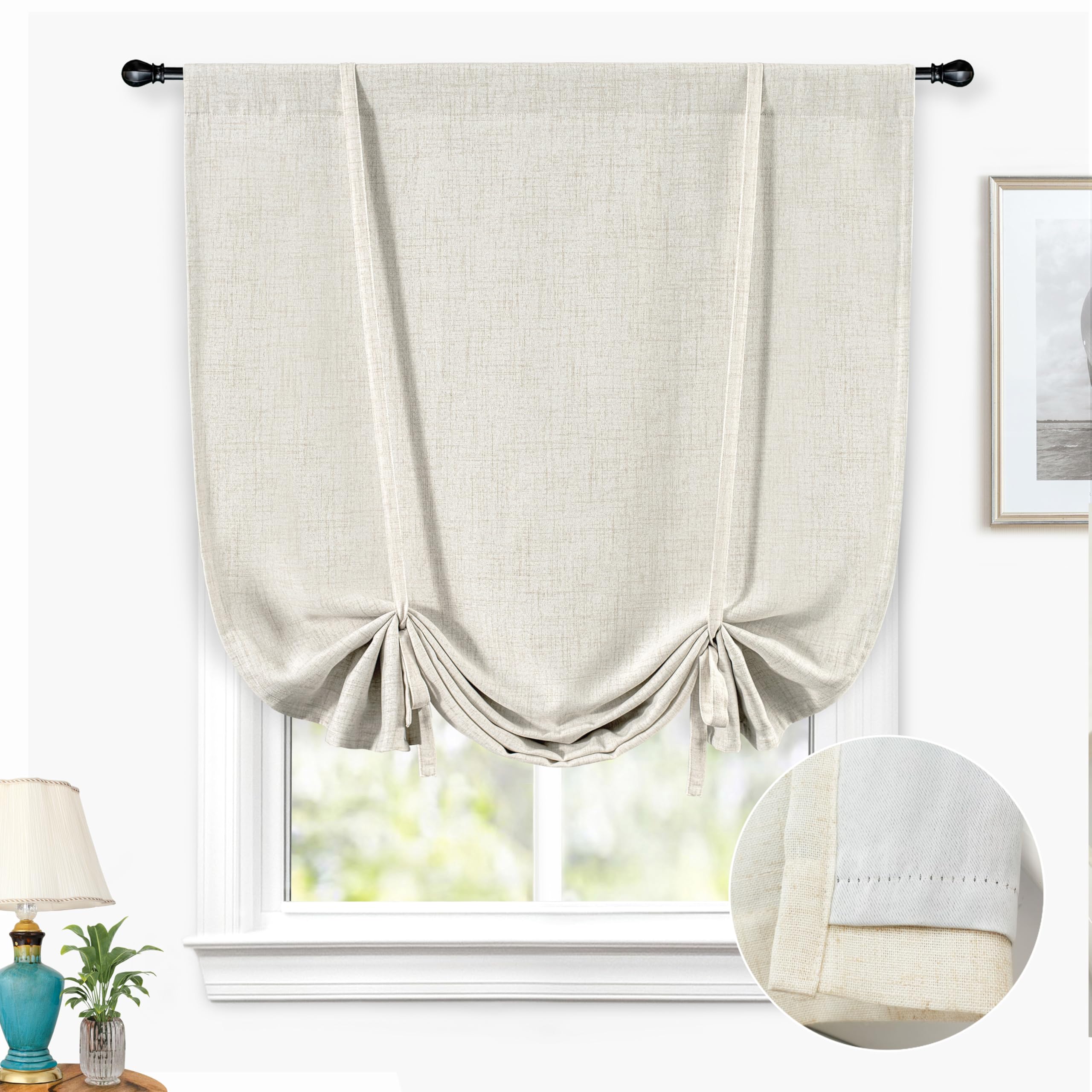 PACKAGE INCLUDES: 1-piece tie up curtain. Made of durable linen blend fabric. Extremely soft to touch, imported. DESIGN & STYLE: Natural light linen color will match with any of your home styles. Hang on this blackout tie up curtain can provide a more lively and relaxing atmosphere in your room. It creates a stylish and artistic element for the room, and is perfect for Christmas, Holiday, Thanksgiving Day and other festivals. Our fabric is 100% none-chemical smell, eco-friendly. EASY ADJUST & SERVE WELL: It is easy to adjust to the height per your need for shading and privacy protection, feature high performance on light reducing, thermal insulated, noise reducing, energy saving / efficiency and privacy protection. Perfect for small window of home, kitchen, breakfast room, bathroom, living room and bedroom. SIZE & HEADER TYPE: 39”W X 55”L. 3.5” Rod Pocket slides easily onto your curtain rod for quick installation. CARE INSTRUCTIONS: Machine wash cold on a gentle cycle in a mesh bag, use only non-chlorine bleach when needed. Tumble dry low, iron on a cool setting. Our tie up curtain provides a modern elegant look, and is perfect for living room, bedroom, dining room, kids room or any indoor space of your home. Hang this tie up curtain will give your window a perfect look. Solid light linen color basic linen blend tie up will provide an easy and inexpensive way to add color and style to any room of your home.