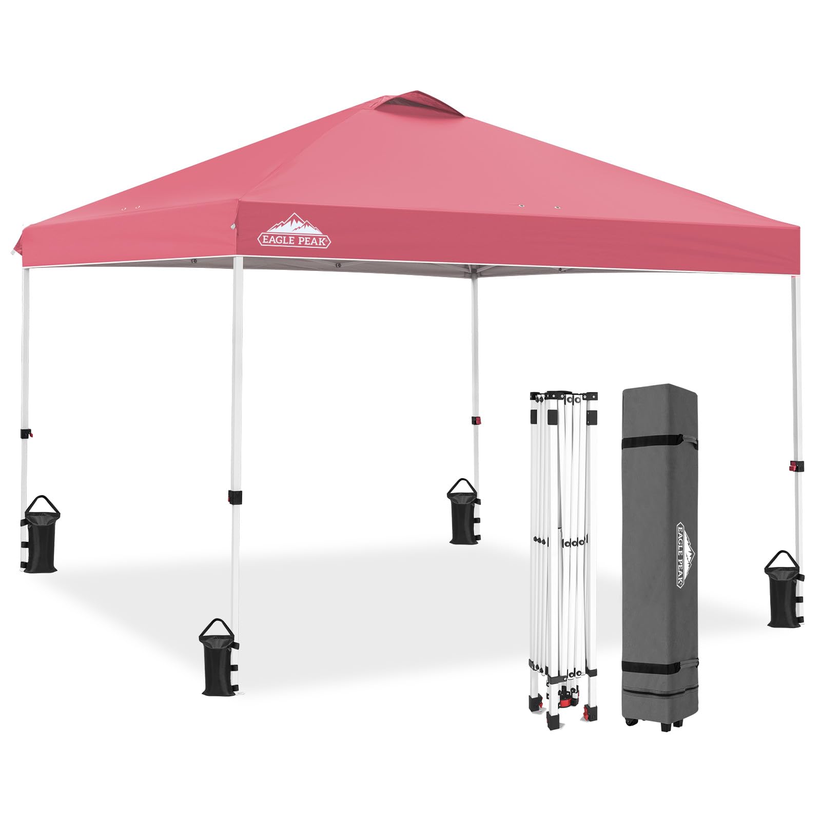EASY SETUP: This easy setup pop up canopy tent features the Peak Push system, a patented canopy center lock. The portable canopy requires no tools and easily opens and closes from the center in seconds. Its unique canopy tent center lock enables a quick, one person setup, letting you maximize outdoor time with minimal effort HEAVY DUTY TOP WITH VENTED DESIGN: The EAGLE PEAK canopy features a CPAI-84 rated 150D silver-coated oxford top with double-stitched and heat-sealed seams for long lasting waterproof performance. This durable pop up canopy provides UPF 50+ sun protection and a large vent at the peak to release heat; ideal for staying cool at outdoor events, markets, or backyard gatherings PREMIUM STEEL FRAME WITH WEIGHT BAGS: Built to perform, the heavy duty canopy frame is made of high-grade, powder-coated steel and secured with hardened through-bolts for superior strength and rust resistance. Whether you’re using it as a canopy tent for events or a pop up tent for shade on the go, the included set of 4 weight bags helps anchor your setup for added stability in outdoor conditions COMPACT AND PORTABLE: Easily take this outdoor tent anywhere with its convenient wheeled bag which fits into most car trunks. Easily bring it along to tailgate and backyard parties, the beach, camping, the park or wherever your fun begins EAGLE PEAK PROMISE: EAGLE PEAK offers 1-year limited after sale protection from the date of purchase. Unlike many other canopy sellers, EAGLE PEAK offers this for our frames, tops and bags! Please contact our professional service team with any questions EAGLE PEAK is a premier greenhouse and canopy brand that delivers innovative product with ease-of-use, combined with premium design aesthetics. EAGLE PEAK is vertically integrated with one of the largest pop-up canopy manufacturers in the world. We invest in our product testing and product innovation laboratory to ensure that our product meets and exceeds industry quality standards and requirements. We are relentless in our efforts to innovate new ways to bring you safe, hassle-free, quality products. Our International & North American Product Development and Design teams work tirelessly to improve upon the status quo and deliver better looking and better functioning product to you.