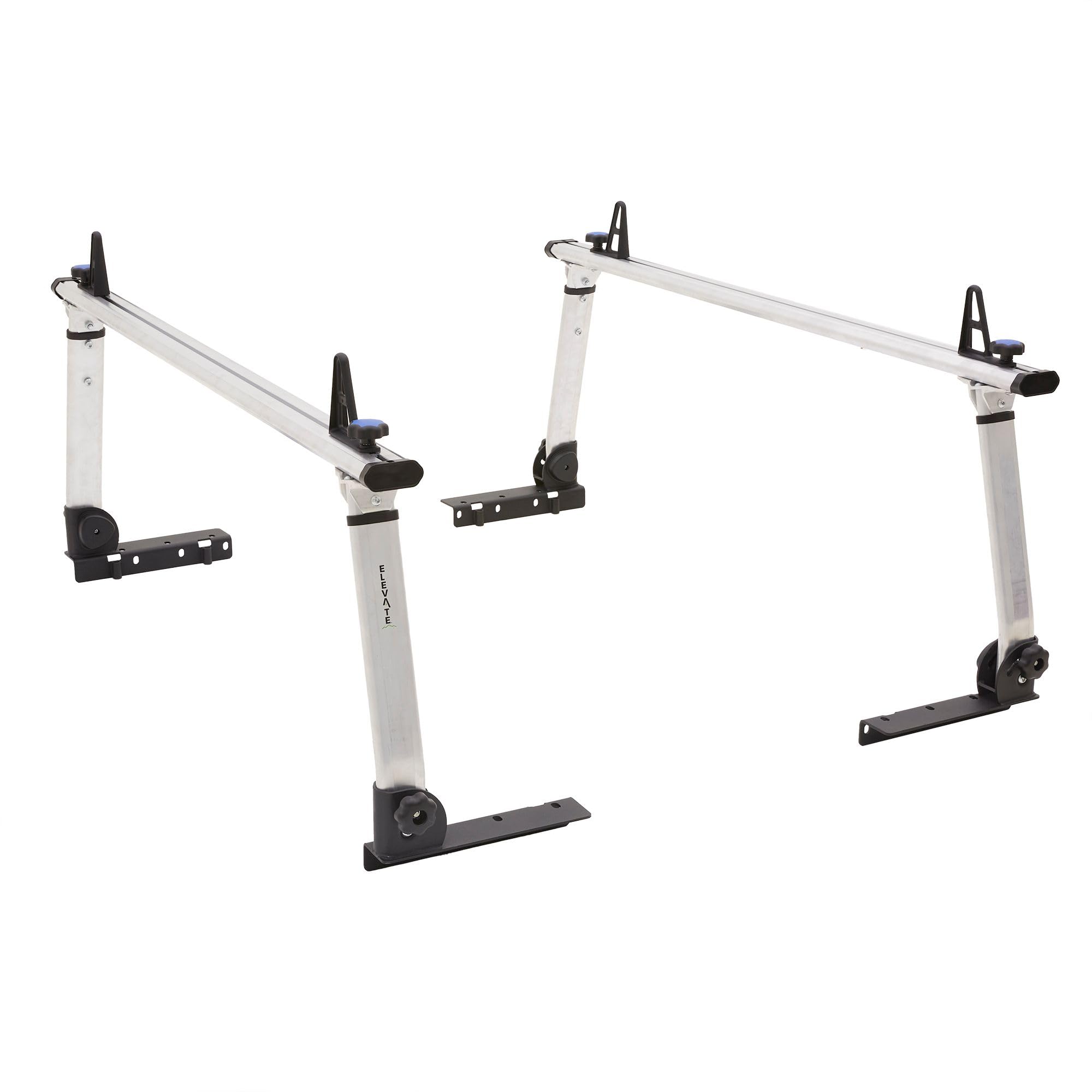 DURABLE AND LIGHTWEIGHT: Manufactured from high-strength, lightweight aluminum with steel mounting brackets; weighs 70.5 lb. 800 LB. LOAD CAPACITY: High-strength, lightweight construction has a maximum load capacity of 800 lbs. distributed across both bars FULLY ADJUSTABLE: Crossbars and sliding system will fit any full, mid-size or compact pick-up truck bed 44" to 66" W; height adjusts from 27" to 33.5" to accommodate cargo of varying sizes EASY INSTALLATION: Quick and easy no-drill, J-clamp installation and includes four adjustable-width ladder stops BEFORE YOU BUY: This rack will not fit trucks with plastic bedliners, embedded siderails, slanted sides, and tonneau covers The height- and width-adjustable Elevate Outdoor Aluminum Truck Rack is designed for no-drill, easy-install convenience. The lightweight aluminum rack accommodates cargo or varying sizes up to 800 lbs. evenly distributed across both bars. Use the four adjustable-width ladder stops to secure items to the rack. This truck rack installs with J-clamps so that drilling into your truck is not necessary. It fits pickup truck beds between 44" to 66" wide, and the top bars have an adjustable height range of 27" to 33.5". The rack assembles easily and is simple to remove when not needed.