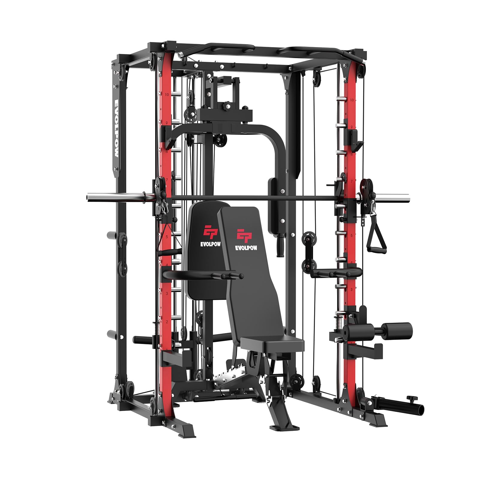 This innovative multi-functional POWER CAGE with Smith Machine is a game-changing addition to home gyms, consolidating 6 strength training stations into one compact unit.