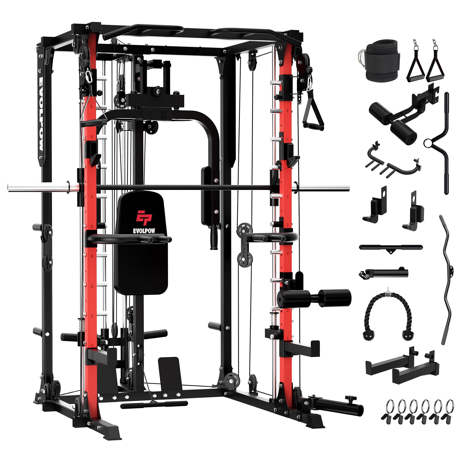 This innovative multi-functional POWER CAGE with Smith Machine is a game-changing addition to home gyms, consolidating 6 strength training stations into one compact unit.