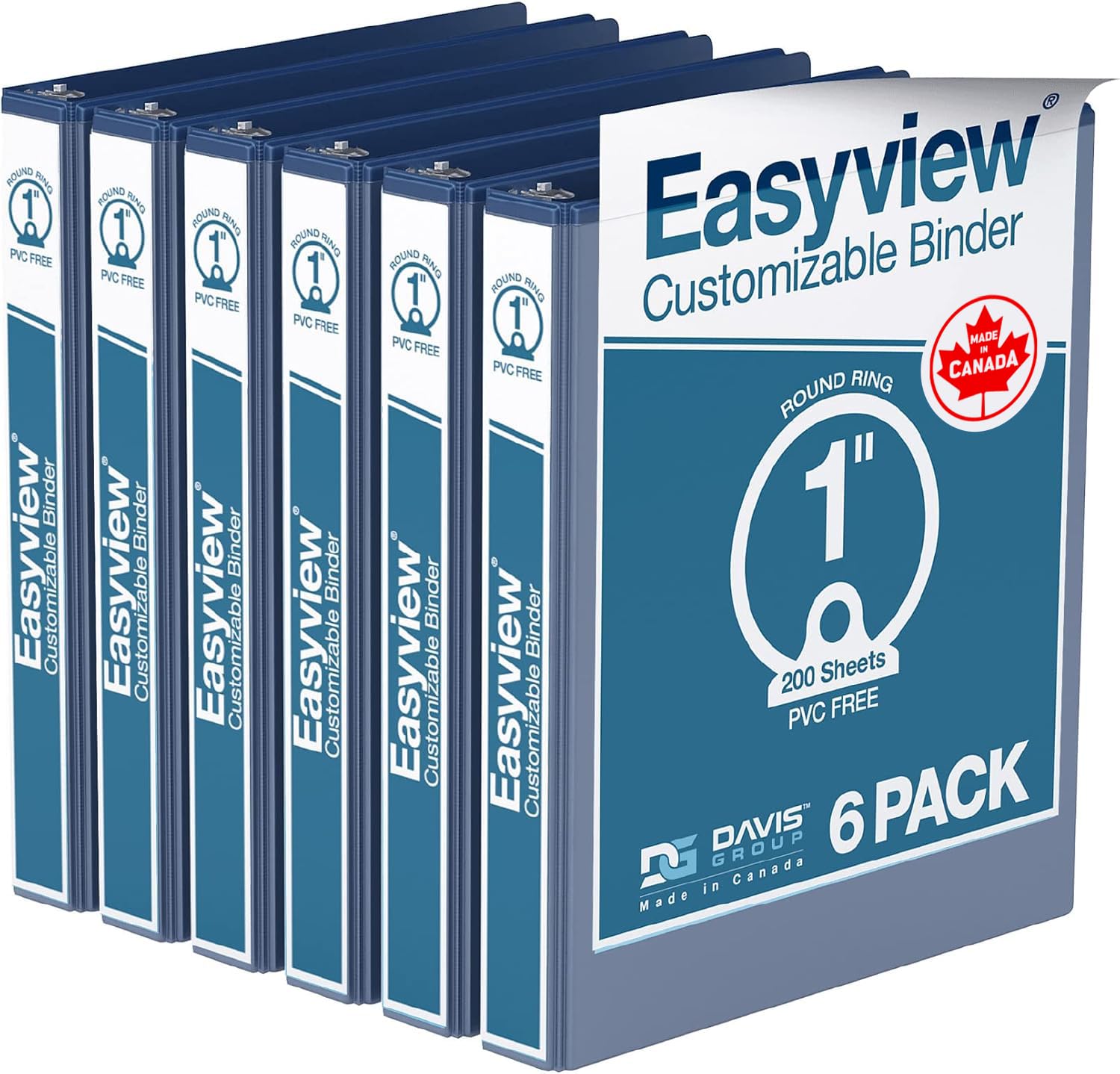 CLASSIC 3-RING BINDERS: Whether you’re heading to college, stocking up on office supplies, or needing homeschooling organization, good binders are essential! Our ring binders are made from 100% recycled board, including 85% post-consumer waste. ROUND-RING BINDERS: These big binders feature round rings and come in 1-inch, 1.5-inch, 2-inch, and 3-inch sizes. The 1-inch binder holds 200 sheets of paper, the 1.5-inch binder holds 275 sheets of paper, the 2-inch binder holds 400 sheets of paper, and the 3-inch binder holds 600 sheets of paper. CLEAR BINDER COVERS: Our view binders come in a variety of colors and have clear pockets on the front and back for complete customization! Each binder with plastic sleeves will help you stay organized. CONVENIENT SPINE LABELS: Each binder spine has a full-width label holder for easy identification. Label your binders by subject, or insert your children’s names to store artwork or schoolwork! Keeping track of important papers has never been easier. CLEAR INTERIOR POCKETS: Store important documents, notes, and more in the handy pockets on the inside of the front and back covers. These clear pockets allow you to easily see any note cards or papers you store inside them. Organize your home, dorm, or office with the Easyview Premium 3-Ring Binders with Clear-View Covers. Each 3-ring binder features clear front and back covers and 2 interior pockets: 1 inside the front cover and 1 inside the back cover. The pockets give you extra room to store small items that you don’t want to punch holes in, such as artwork, loose-leaf pages, or note cards, and the clear material allows you to see what’s in each pocket. Each binder spine has a full-width label holder so you can identify the binder’s contents. You can customize each binder to suit your needs.