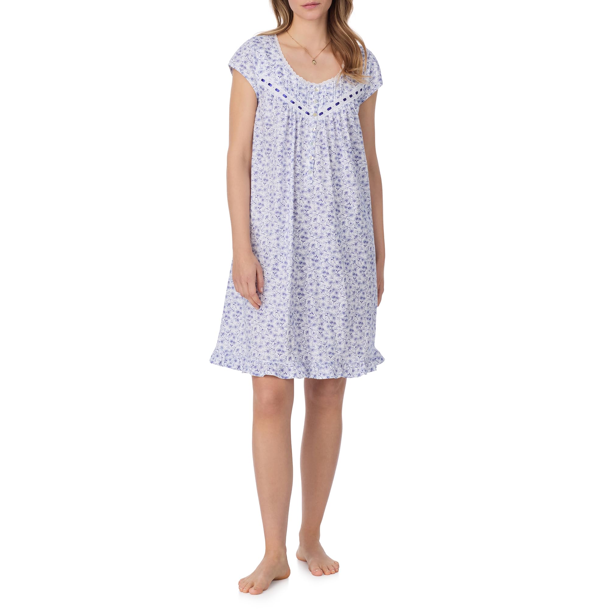ELEGANT DESIGN: A sleeveless, 36" short-length nightgown crafted in cotton jersey knit with a sweetheart neckline trimmed in pintucks and embroidered lace. The yoke features satin ribbon and delicate eyelet lace, finished with Akoya buttons and a baby ruffled hem for a sweet, romantic touch. PREMIUM FABRIC: Made from 100% cotton jersey knit, this style is soft, breathable, and gently stretchy. Lightweight yet cozy, the fabric offers a relaxed drape and seasonless comfort, perfect for warm nights or laid-back mornings. BEAUTIFULLY VERSATILE: Ideal as sleepwear, a house dress, or everyday loungewear, this short cotton nightgown features a full button-front placket for easy nursing access. A flattering and functional piece for new mothers or anyone seeking effortless style and year-round ease. COTTON JERSEY KNIT COLLECTION: Offering the perfect balance of cozy softness and breathable lightness, our Cotton Jersey Knit collection includes cap sleeve gowns, nightshirts, and pajama sets - all finished with signature lace details and relaxed silhouettes ideal for lounging or sleep. SINCE 1978: Eileen West has been devoted to the art of sleepwear - creating garments born from grace, comfort, and timeless beauty. Inspired by California’s coastal light and wildflower fields, our designs are crafted in natural fabrics with delicate details and feminine silhouettes. Made for life’s quietest moments - rocking newborns to sleep, writing letters at dusk, or lingering over morning coffee - each piece reflects our enduring love for craftsmanship and romance. Discover the art of softness and grace with the Cotton Jersey Knit Collection by Eileen West - a delicate sleepwear line inspired by the tranquility of nature’s quietest moments. Crafted in 100% cotton, each gown features a whisper-light texture and elegant drape, offering a breathable, airy feel that gently moves with the body. Flowing silhouettes, refined pintucks, and subtle lace accents come together to create sleepwear that feels as poetic as its name suggests. Designed for those who savor stillness, reflection, and beauty in the everyday, these pieces transform even the smallest routines into rituals of comfort and calm. Eileen West sleepwear reflects timeless femininity through pieces that combine classic elegance with wearable ease. This collection includes flowing cotton nightgowns and refined silhouettes ideal for warm-weather comfort and year-round relaxation. Blending vintage inspiration with modern simplicity, these nightgowns are perfect for those seeking breathable cotton sleepwear, soft loungewear, or a luxurious alternative to traditional pj sets. The lightness of the fabric, combined with romantic detailing, offers a feeling of quiet luxury - ideal for sleep, lounging, or slow weekend mornings. Perfect gift giving idea for those who love comfort and feminine details. Since 1978, Eileen West has been dedicated to creating sleep and loungewear that balances beauty with comfort. The Jersey Knit Collection continues that legacy - celebrating the art of rest with pieces that feel as serene as the moments they’re made for.